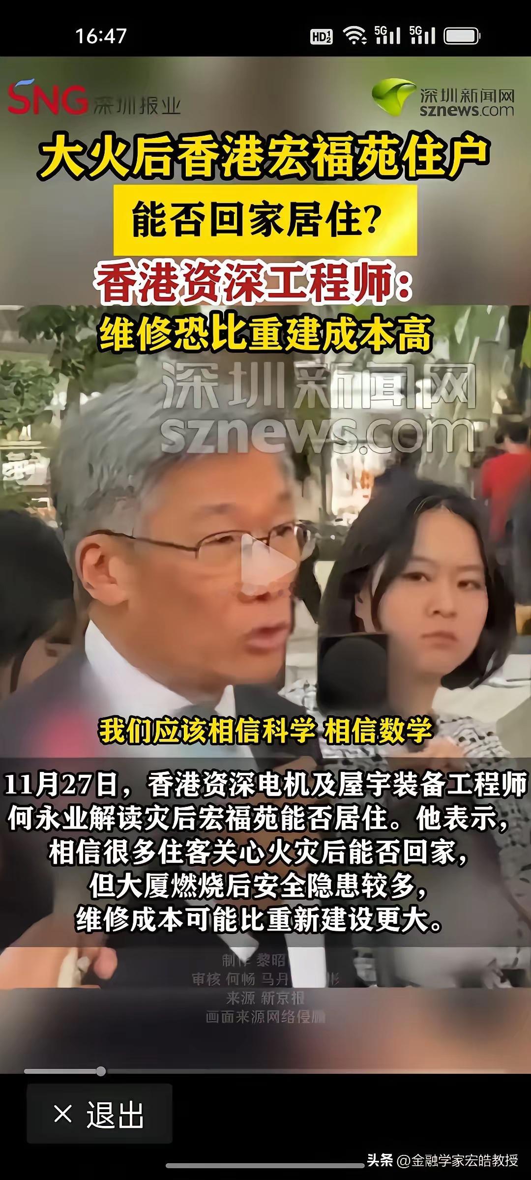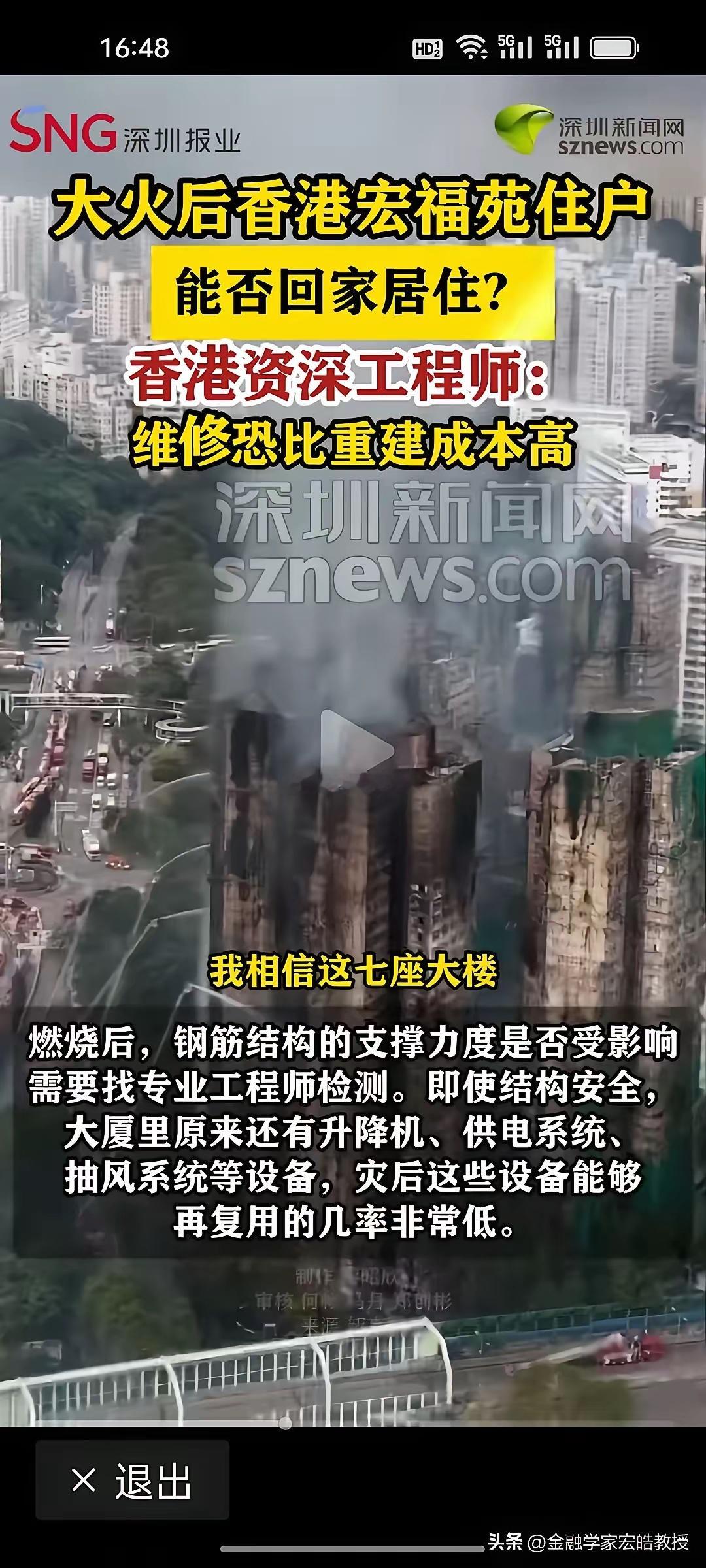 香港宏福苑估计很快会重建了。刚刚看到香港资深工程师说了香港宏福苑的维修成本比重建成本高。灾后的供电系统,抽风系统能够重新使用的概率很低。很多居民都在问能否回家住,这位资深工程师的话几乎已经给出了答案。毕竟是42年的老楼,修缮的费用高昂,还不如原地重建,香港政府已经出资3亿,内地60家企业捐款已经超过5亿,香港的富豪家族捐款也超过过2亿,再加上其他捐赠,建七幢楼估计在15亿左右,这个资金还是足够的。只是再建的话希望不再建那么高,一幢楼17层左右为最佳,符合香港消防云梯55米的基本救援要求。