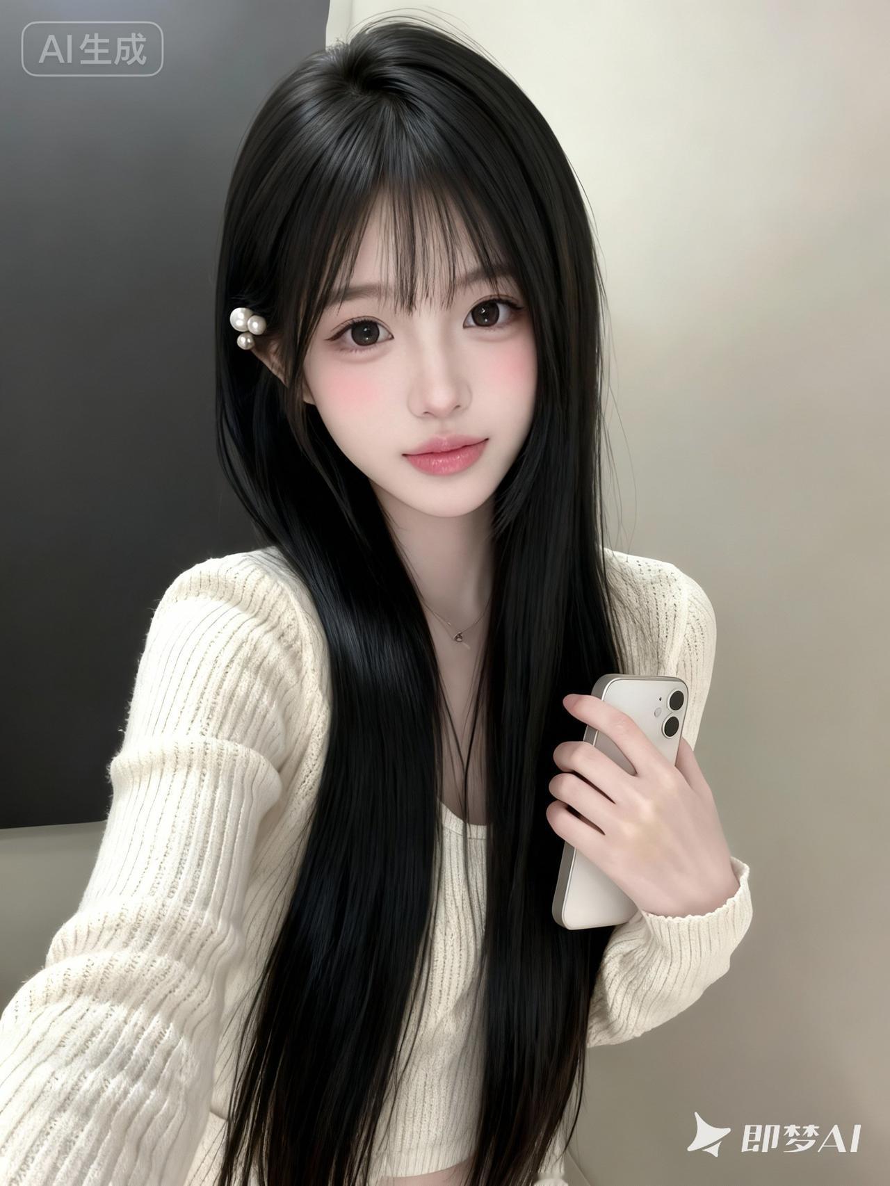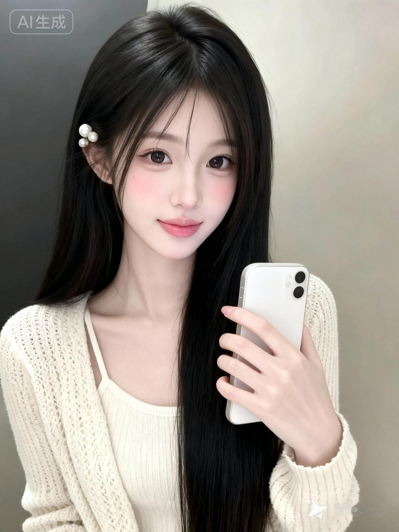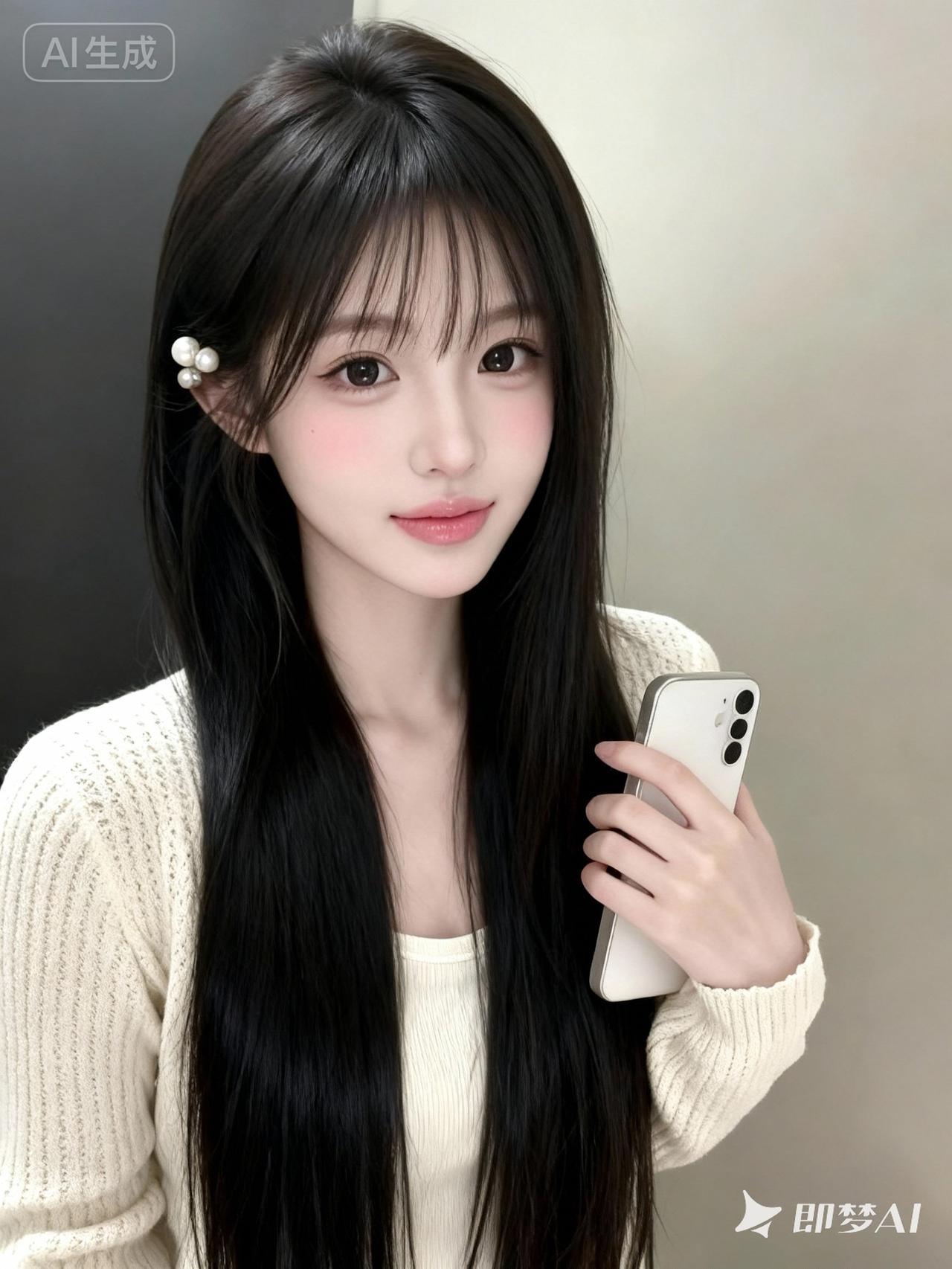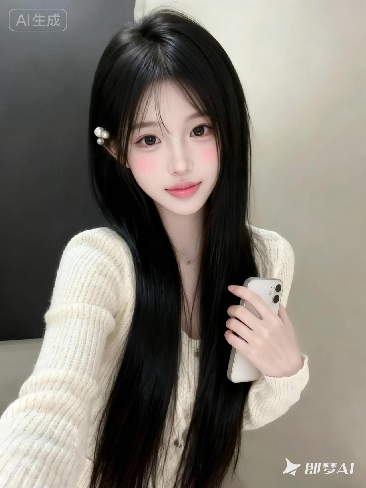 一位年轻的东亚少女,18岁左右,长相甜美清纯,鹅蛋脸,皮肤白皙细腻,妆容淡而精致(粉色腮红、自然唇色),大眼睛明亮有神,黑色长发柔顺有光泽,长度及腰,刘海自然垂落修饰脸型