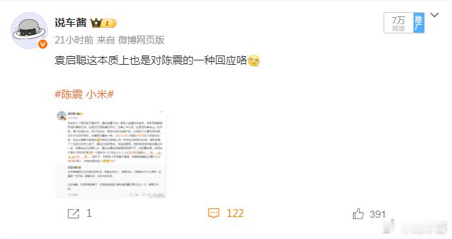 陈震这次袁启聪吵架,袁启聪说不会和陈震吵,这样除了让看热闹的爽,毫无好处我当时转发时心想,只怕我等看热闹的也不会太爽毕竟他们两个再大咖也只是局限于汽车圈内,能有多少流量,圈地自萌罢了结果今天一看微博,阅读量不高,但这评论不少啊,虽然多数是被屏蔽了这么一看,就不难理解如今汽车媒体圈的乱象了陈震 袁启聪