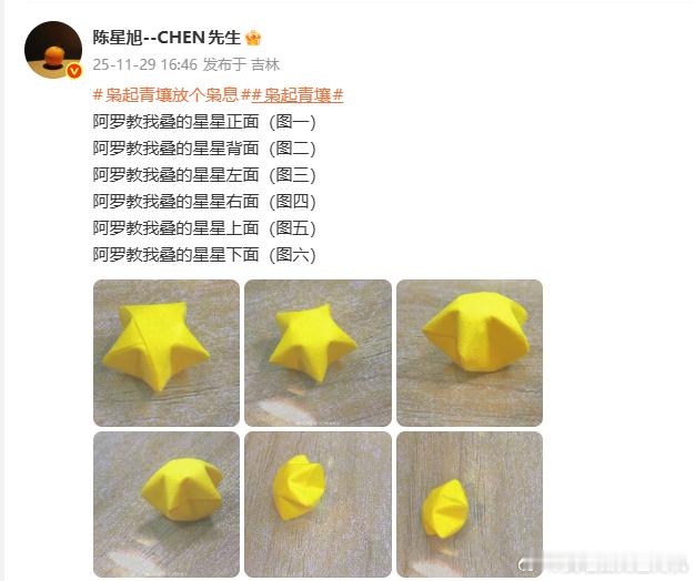 阿罗教我叠的星星迪丽热巴回复陈星旭 阿罗教我叠的星星,迪丽热巴回复陈星旭:炎总,倒也不必给星星的每个部位都拍证件照,咱就说一整个有被两位的互动可爱到啦~