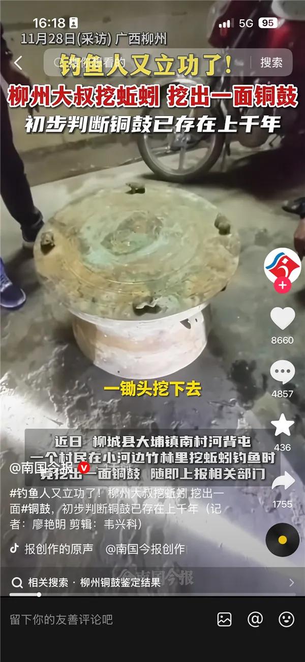 大叔挖蚯蚓,竟刨出60斤千年“宝藏”! 近日,广西柳州柳城县大埔镇南村河背屯的村民杨建球,在村边竹林挖蚯蚓当钓鱼饵时,意外挖出了一件近60斤重的“大宝贝”——一面保存完好的千年铜鼓。 起初,杨建球挖到坚硬的金属物时并未在意,待清理掉泥土后,才发现是一面造型古朴的铜鼓。这面铜鼓鼓面直径69厘米、高44厘米,重达59斤,鼓面中心刻有太阳纹,边缘铸有四只分占四方的青蛙纹饰,铜鼓虽深埋地下千年,敲击时仍能发出清脆悦耳的声响。 据当地文物部门介绍,这是柳城首次出土古代铜鼓,初步考证其铸造于汉至唐代,距今已有上千年历史。铜鼓曾是古代南方民族的礼乐器,兼具祭祀、指挥战争等功能,它的出土也印证了千年前柳城地区活跃的文化交流。 发现铜鼓后,杨建球第一时间上报文物部门,如今这面铜鼓已被柳城县博物馆妥善保管,并上报自治区做进一步鉴定。这件意外现世的千年文物,也让普通村民的一次日常劳作,成为了当地文物保护的一段趣谈。