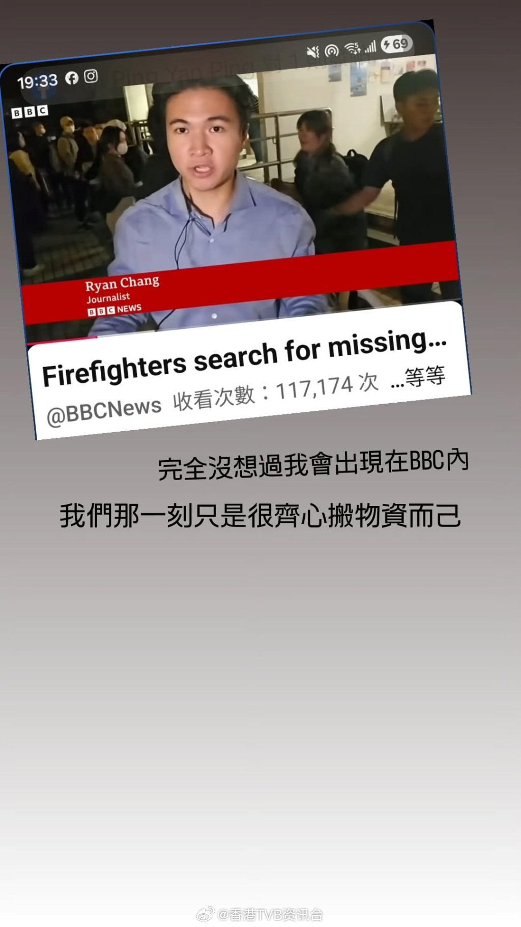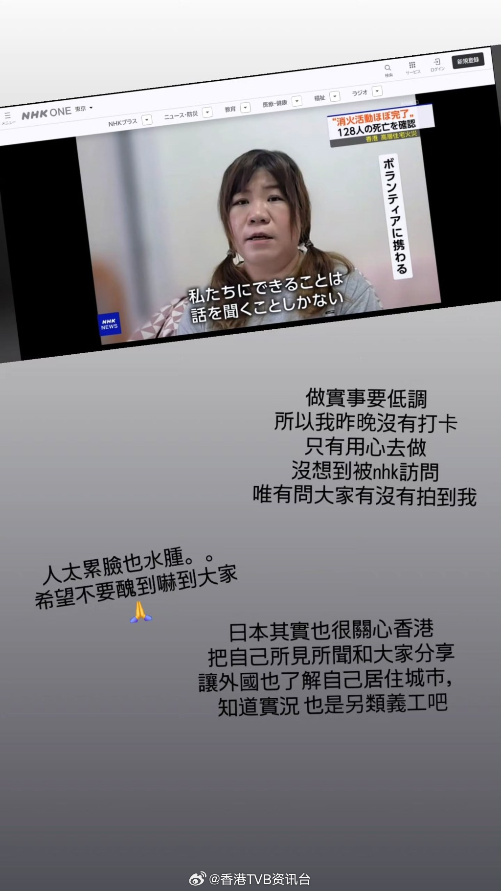 星岛:大埔宏福苑五级火|《爱回家》"池美丽"通宵做义工连踩12个钟:我们都是香港人 遇灾民身上仅得100元大埔宏福苑日前发生五级大火,造成严重伤亡,无数居民家园尽毁,流离失所。在全城心痛之际,不少市民自发前往现场,为灾民送上温暖与支持。TVB处境剧《爱·回家之开心速递》中饰演"池美丽"的演员钟凯琪(Kitty)近日亦只身到场做义工,她表示当日她由夜晚开始做了12小时义工到晨早并走上3万步,但一样毫无怨言,并意外得到NHK(日本放送协会)邀请采访。"池美丽":"我和每一个香港人一样"钟凯琪事后在社交平台分享了她做义工的经历与心声。她表示,当看到这宗不想发生的事件时,内心深受震撼,不由自主地想为社会贡献一分力量。为此,她毅然取消了原定的工作,独自一人投入大埔的义工服务。她表示"我和每一个香港人一样",她的行动,印证了香港人在危难关头守望相助的精神。"池美丽"变"点心姐姐" 关怀灾民到达现场后,钟凯琪发现许多受灾居民因为彷徨和害羞,即使需要物资也不敢主动求助。于是,她急中生智,向附近超市借来一架购物车,装满食物和水,化身"点心姐姐",在屋苑范围内来回奔走,主动向有需要的人派发物资。"池美丽"遇上灾民身上仅得100元这个看似"老土"的方法,却让她成功接触到不同背景的灾民。她遇到了因火灾而暂时无法回家的长者、失去了所有财物只剩下100元傍身的灾民。这些经历让她深刻反思:"我们去做义工的目的到底是什么?是单纯把物品发放下去,还是透过赠送物资,用心去关怀他们呢?""池美丽"12小时3万步的坚持从黑夜到清晨,钟凯琪连续工作超过12个小时,手机纪录她走了近3万步。尽管身心俱疲,但她毫无怨言,并承诺在休息过后,只要有需要,便会再次回来帮忙,满满的正能量感动了许多网民。"池美丽"意外获NHK采访在默默付出的同时,钟凯琪的善举也吸引了日本放送协会(NHK)的注意,并获邀接受访问。对此,她谦虚地在社交平台上说:"人太累脸也水肿,希望不要丑到吓到大家"。她认为,能借此机会将香港的真实情况和港人互助的精神分享给外国观众,也是另一种形式的义工服务。
