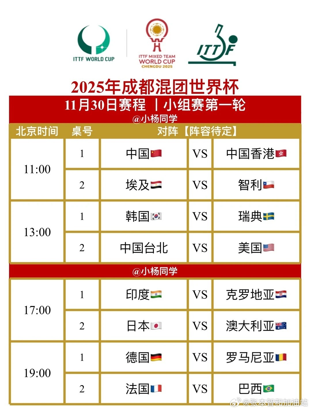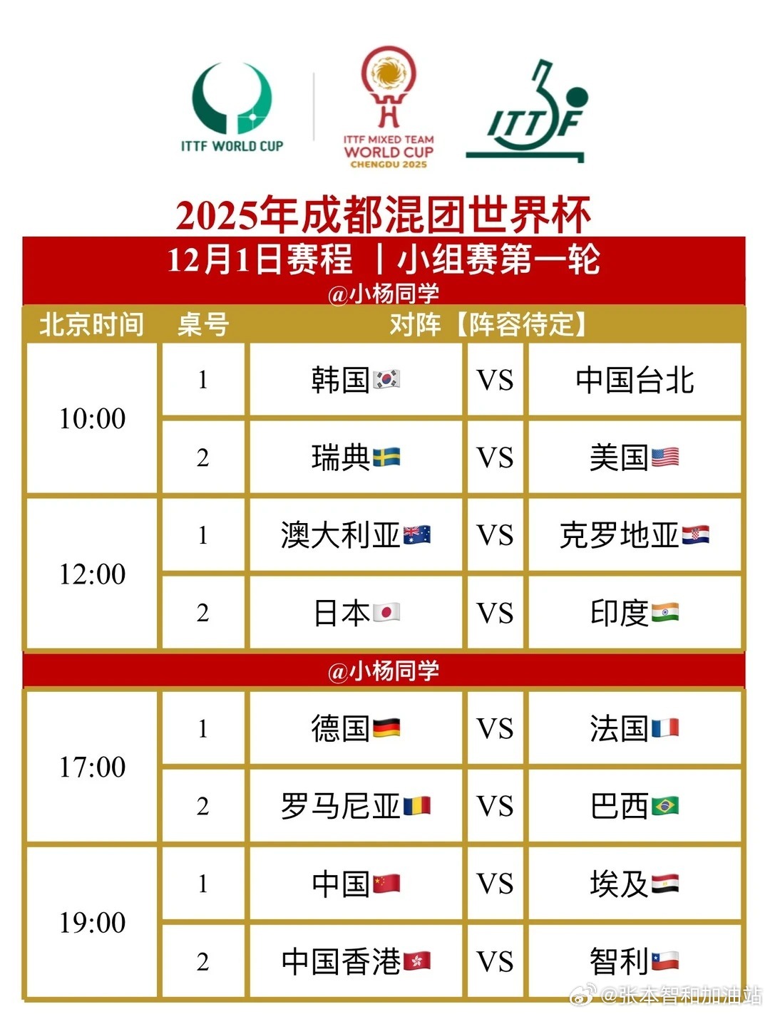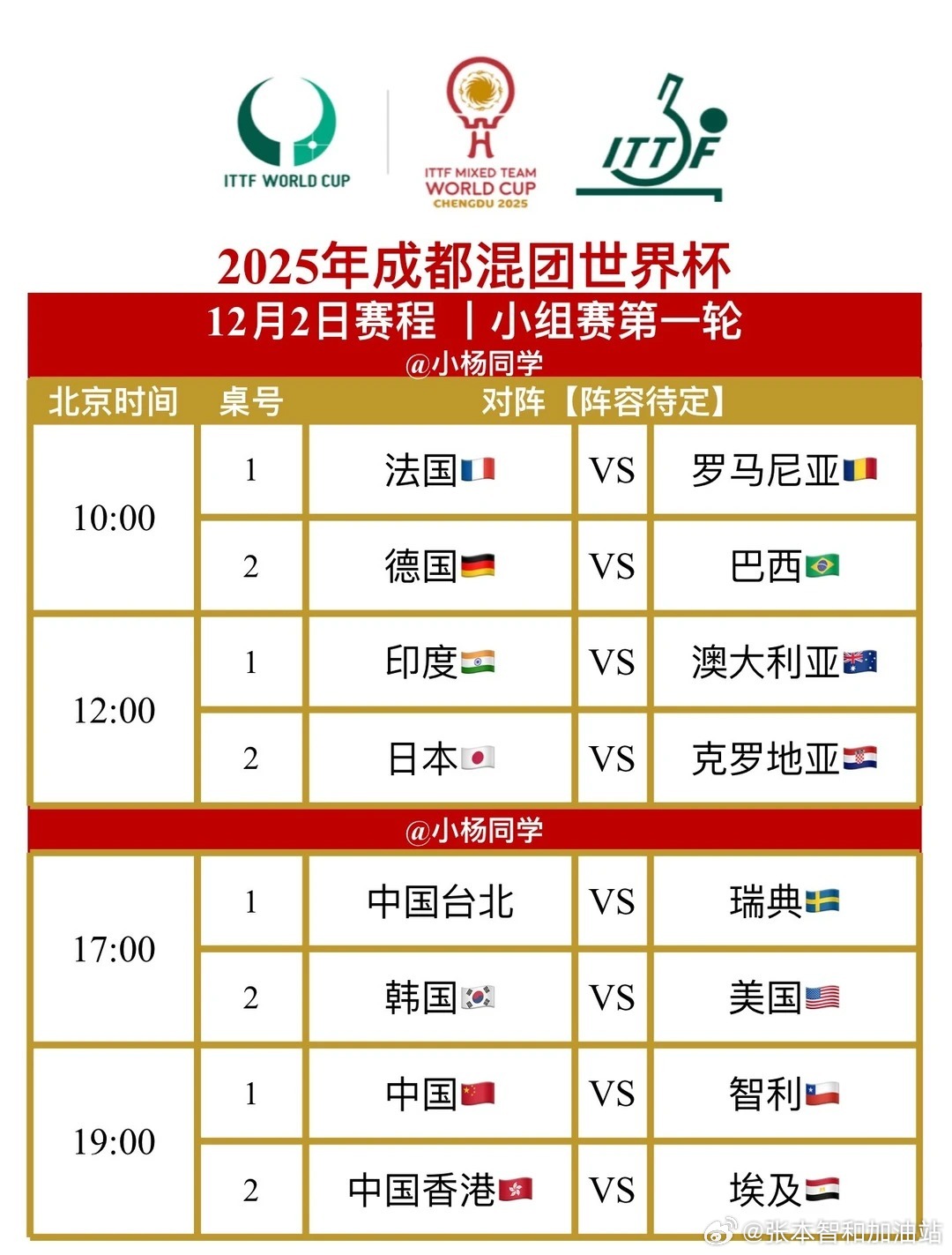 ITTF混合团体世界杯2025张本智和 日本队和印度、澳大利亚、克罗地亚同分在第二组。小组赛日程:11月30日 17:00 日本 Vs. 澳大利亚 2号桌12月1日 12:00 日本 Vs. 印度 2号桌12月2日 12:00 日本 Vs. 克罗地亚 2号桌图片: