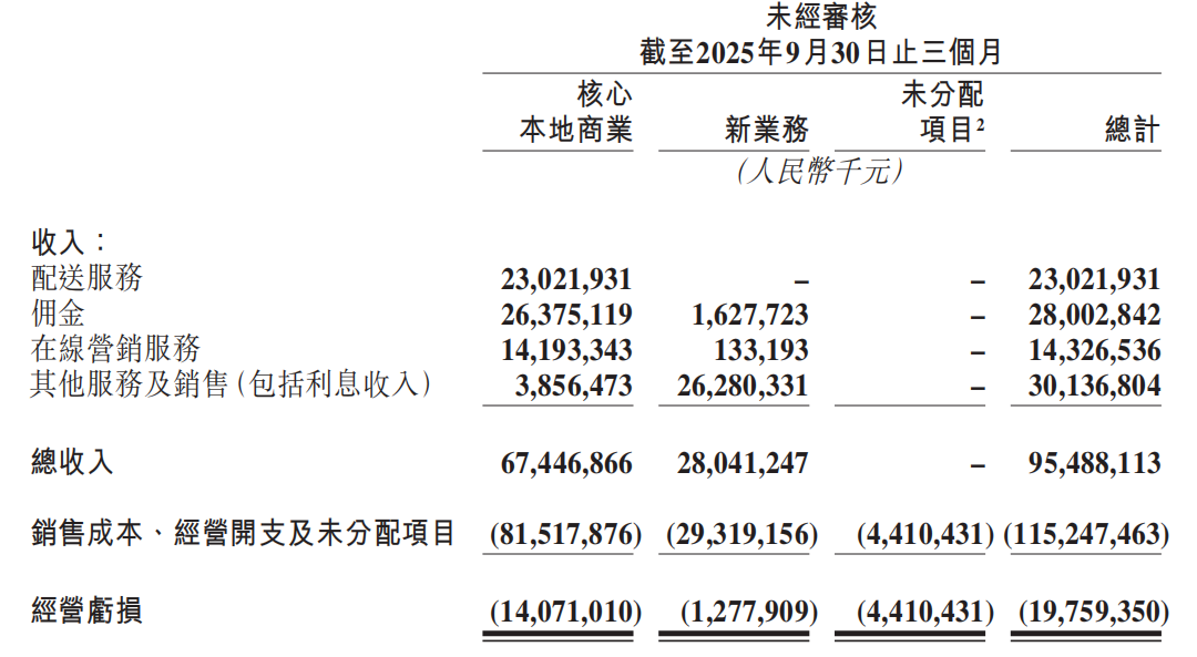 整体来看,三季度美团经营亏损197.59亿元,经营亏损率20.7%;期内亏损186.32亿元,亏损率19.5%;经调整EBITDA为亏损148.42亿元,经调整亏损为160.10亿元。