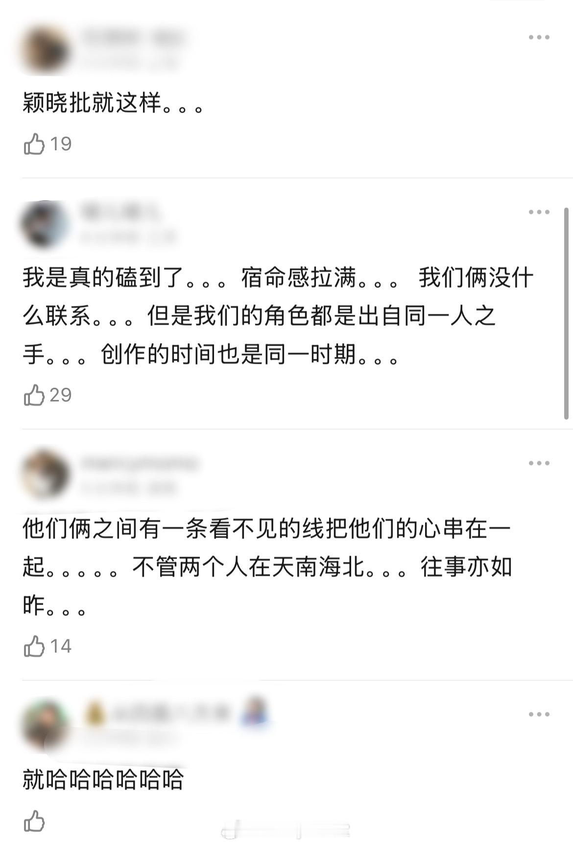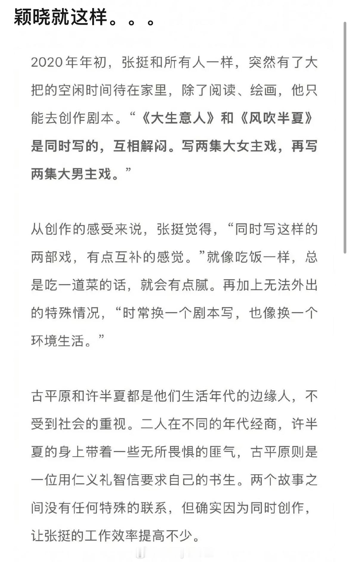 张挺说陈晓的《大生意人》和赵丽颖的《风吹半夏》是同时写的,互相解闷。写两集大女主戏,再写两集大男主戏,同时写这样的两部戏,有点互补的感觉。颖晓就这么宿命感拉满,两人没什么联系,但他们饰演的角色都是出自同一人之手,甚至创作的时间也是同一时期,真的是剪不断
