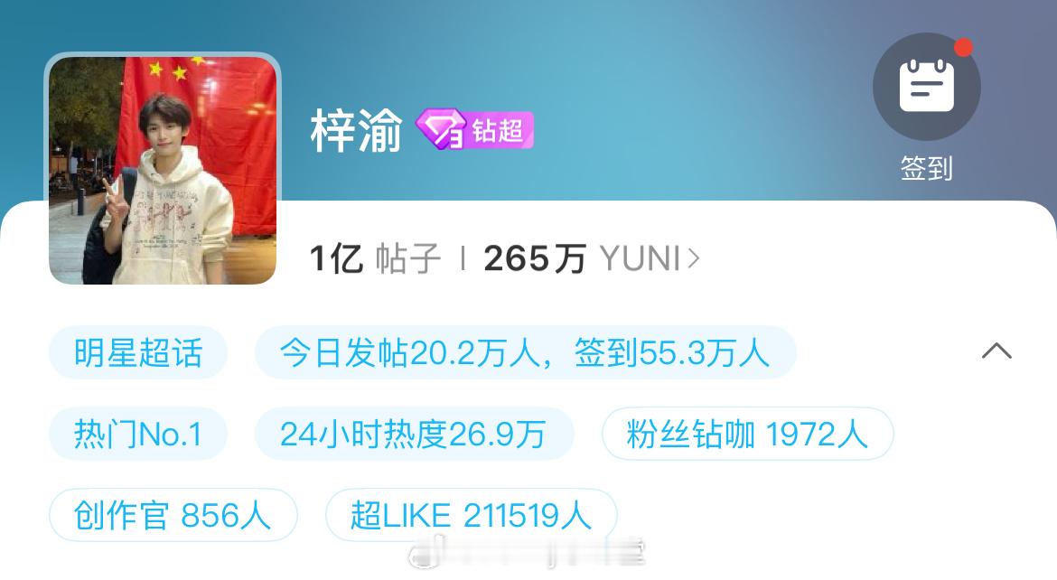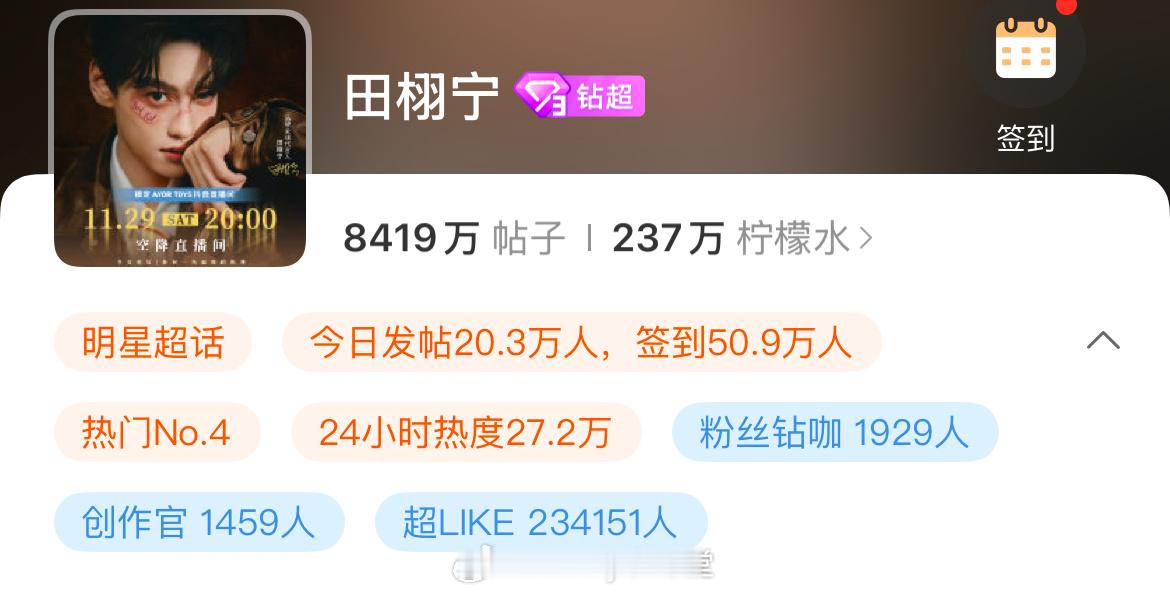梓渝、田栩宁的巅峰相见!梓渝超话帖子破亿,田栩宁的是即将破亿,就这么手拉手登顶