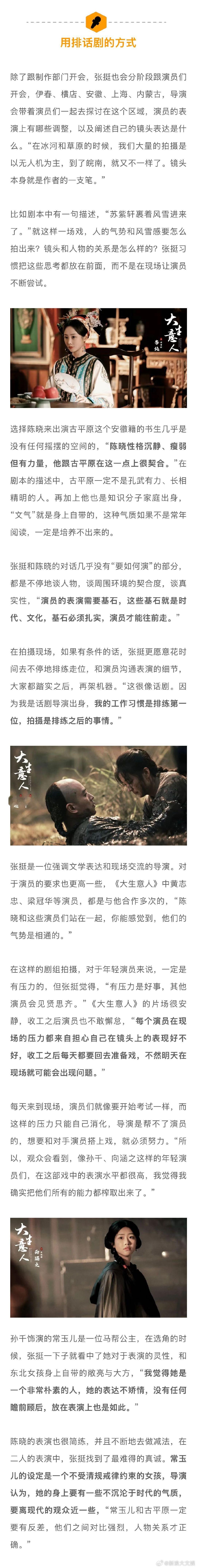 导演在陈晓孙千身上找到了真诚 大生意人导演谈男女主角感情线 2020年年初,张挺突然有了大把的空闲时间待在家里,除了阅读、绘画,他只能去创作剧本。“《大生意人》和《风吹半夏》是同时写的,互相解闷。写两集大女主戏,再写两集大男主戏。”从创作的感受来说,张挺觉得“同时写这样的两部戏,有点互补的感觉。”娱理独家↓
