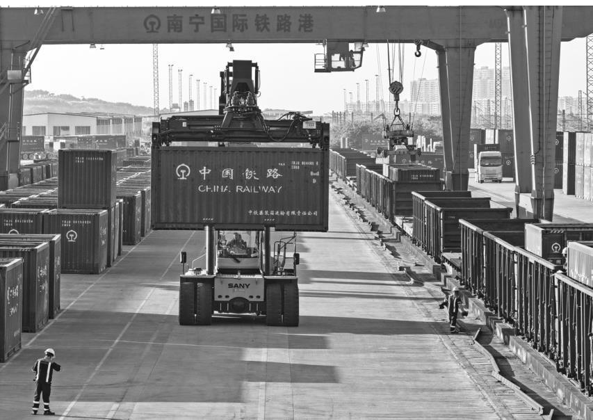 中国铁路南宁局集团有限公司最新统计显示,2025年中越班列呈现开行常态化、运量激增的特点。截至今年10月22日,广西始发中越班列已累计发运出口货物2.9万标箱,同比增长143%。图为南宁国际铁路港一景(11月28日摄,无人机照片)。