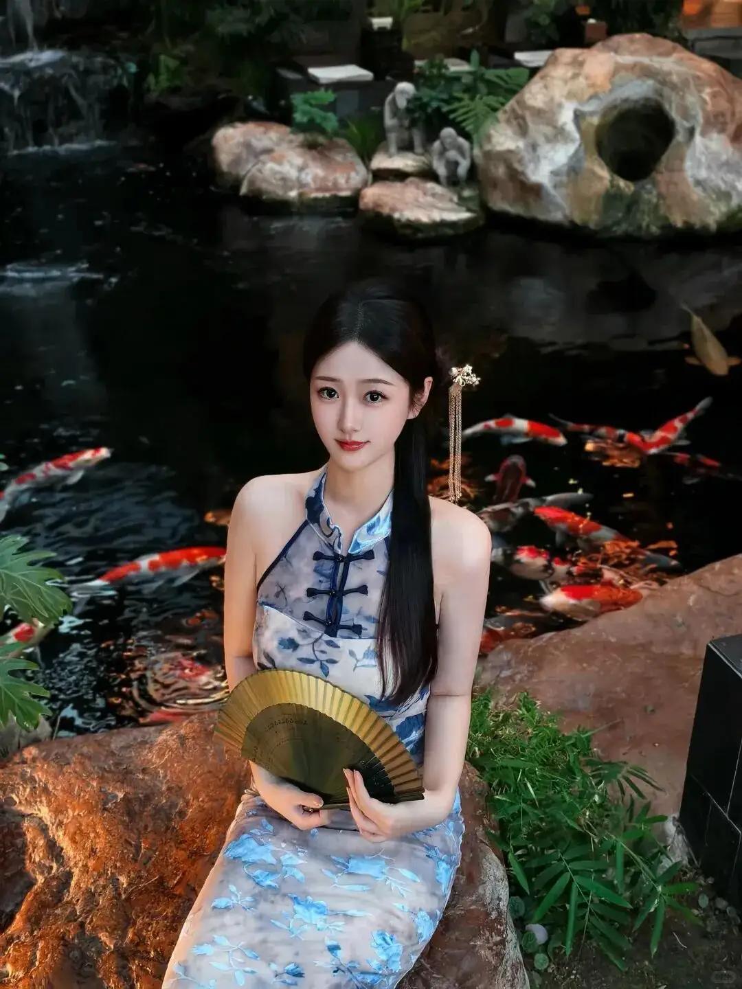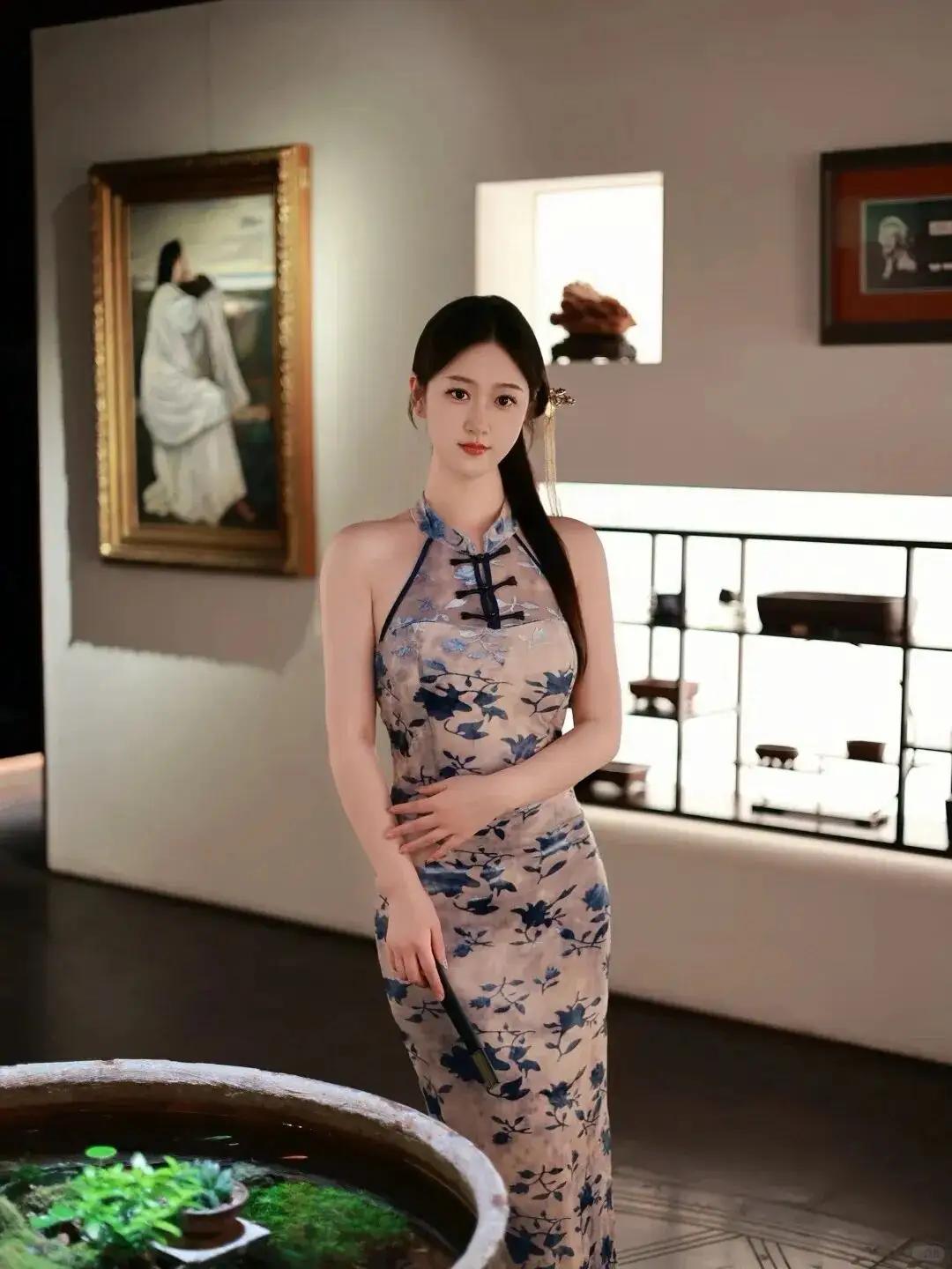 《旗袍女子的静美时光》 午后阳光透过窗棂,在红丝绒沙发上洒下斑驳光影。一位女子端坐其间,身着月白色无袖旗袍,衣料上晕染着靛蓝缠枝纹,恰似宣纸上洇开的工笔花鸟。旗袍领口处七枚黑玛瑙盘扣错落有致,宛如缀在玉颈间的墨色星子,与袖口滚边的玄色绲边遥相呼应。 女子青丝如瀑,在颈后松松挽成低髻,一支鎏金点翠发簪斜插鬓间,簪头垂落的珍珠流苏随着呼吸轻轻摇晃。她双手交叠置于膝上,指甲透着健康的粉晕,腕间翡翠镯子泛着温润水光。当目光掠过她含笑的唇角时,会发现那抹笑意里藏着江南烟雨般的朦胧——三分矜持,七分温婉,恰似旗袍开衩处若隐若现的风景。 黑色铁艺屏风在她身后交织成几何光影,菱形格栅间的留白处,隐约可见墙面肌理如宣纸褶皱。沙发扶手上搭着的浅灰披肩,流苏垂落处与旗袍下摆的如意纹形成奇妙对话。这个充满现代设计感的空间,因她的存在忽然有了时空交错的诗意。 阳光悄悄爬上旗袍的缠枝纹,那些蓝印花便活了过来。衣襟处的并蒂莲在光影中舒展,袖口的云水纹泛起粼粼波光。当微风拂动屏风后的纱帘,她耳畔的珍珠耳坠便轻轻摇曳,将细碎光斑投在瓷白的颈侧。此刻的静谧里,连空气都浸染着檀香扇与茉莉香片的清韵。 这帧画面最动人的,是传统与现代的完美共生。铁艺屏风的冷峻线条,衬得旗袍的柔美愈加鲜明;沙发鲜艳的西洋红,愈发显出月白旗袍的清雅。而她端坐其中的姿态,既保持着民国闺秀的仪范,眉宇间又透着当代女性的从容。当最后一缕夕阳掠过翡翠镯子,我终于懂得:真正的东方美,从不在博物馆的玻璃柜里,而在这样鲜活的生命律动中。