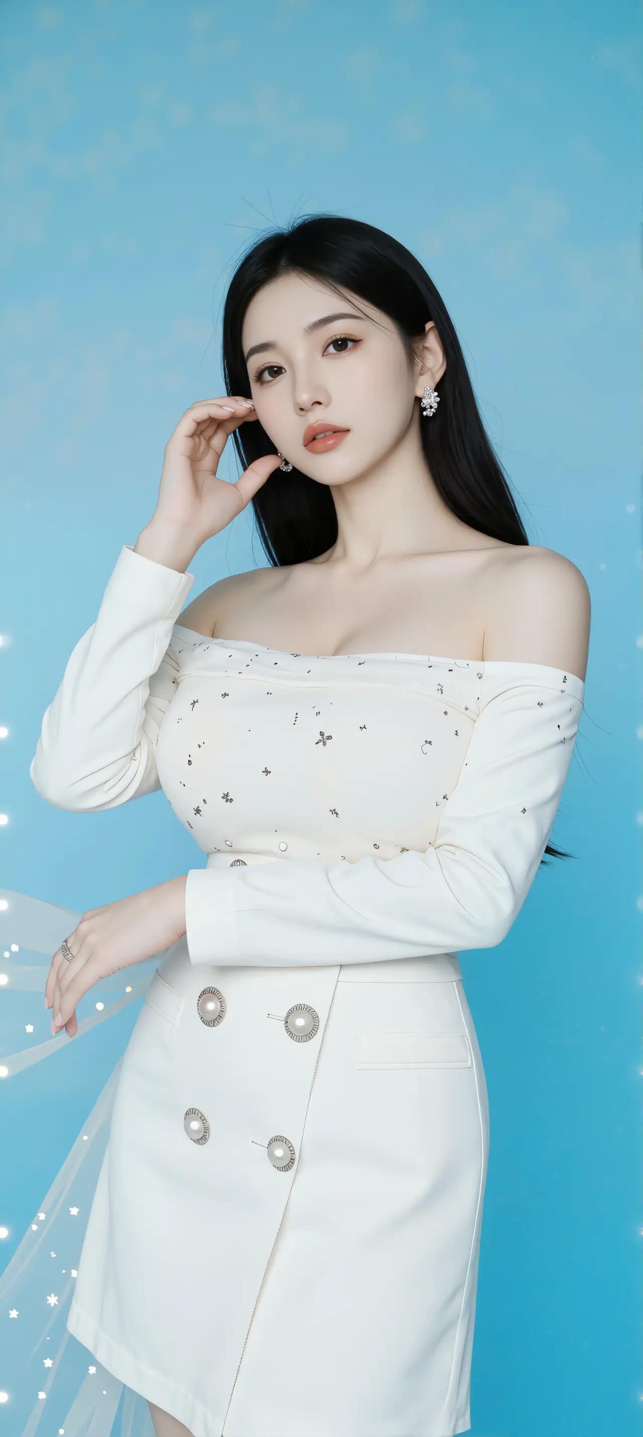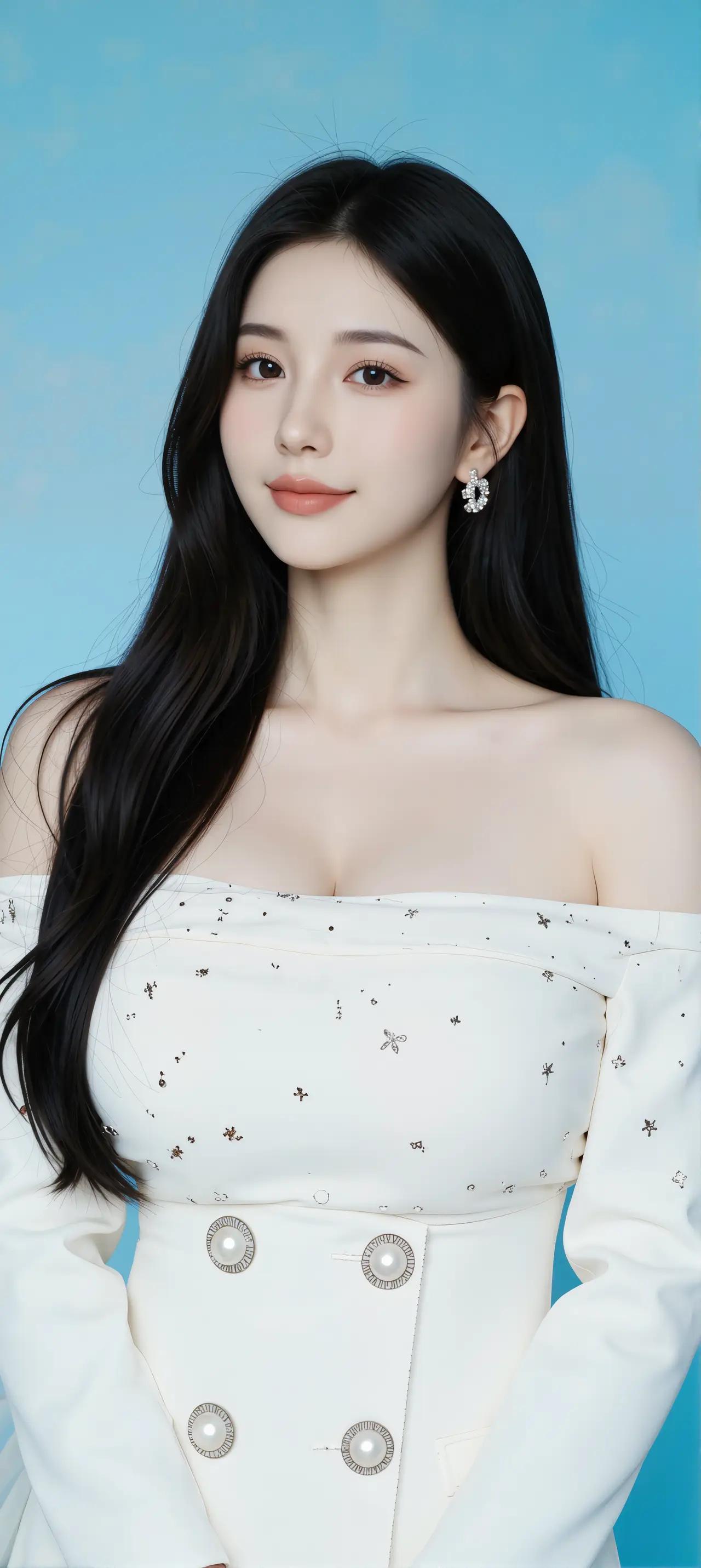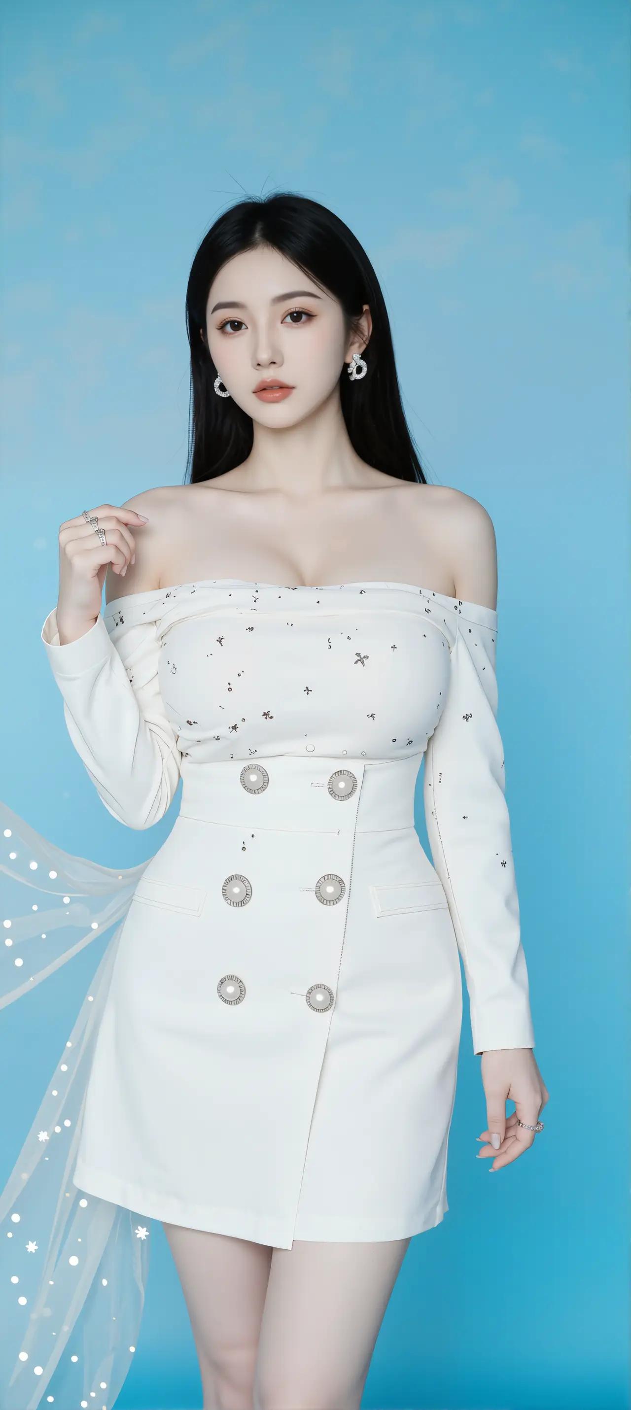 在浅蓝色的背景前,一位女子静静伫立,宛如一幅精心绘制的油画。她乌黑的长发如瀑布般倾泻而下,发丝间流转着柔润的光泽,与白皙的肌肤形成动人的对比。露肩设计的白色上衣缀满细碎亮片,每当光线掠过便泛起星子般的微光,恰似银河倾洒在肩头。金色纽扣沿着短裙腰线蜿蜒而下,如同在纯白雪地上撒落的阳光碎金,为简约的剪裁注入灵动气息。 她的双手交叠置于身前,指间那枚素圈银戒折射出清冷的光晕。耳畔垂落的钻石耳钉随着呼吸轻轻摇曳,在颈侧投下细碎的阴影。这种克制的奢华与整体造型浑然一体,既保留了少女的纯净感,又透露出经过岁月淬炼的从容气度。摄影师显然深谙留白之道,浅蓝背景既像黎明时分的天空,又如无垠的海面,将观者的视线牢牢锁在人物身上。 当目光掠过她微扬的唇角,会发现那抹笑意里藏着双重意境——既有初见世界的明媚,又带着洞悉世事的淡然。这种矛盾的美感在她身上达成奇妙平衡,正如那件上衣的设计:露肩的性感与立领的端庄,亮片的华丽与纯白的素净。现代女性特有的多面性,在这个瞬间被镜头永恒定格。 光影在丝质面料上编织出粼粼波纹,仿佛能听见衣料摩挲的沙沙细响。画面中的每个细节都在诉说精心却不刻意的美学追求,从裙摆恰到好处的褶皱,到发梢自然微卷的弧度。这不仅是时尚的演绎,更是对生活美学的具象呈现——真正的优雅,从来都是举重若轻的艺术。