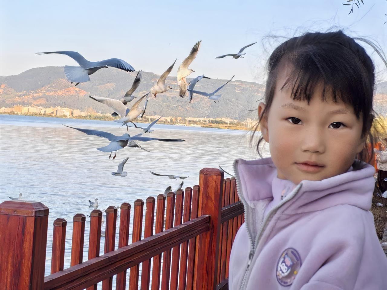 一年一度寒冬至, 海鸥万里赴通海。 此乃通海好挚友, 贵客莅临当善待。 小美女亦来喂鸥, 人小心善倩影在。