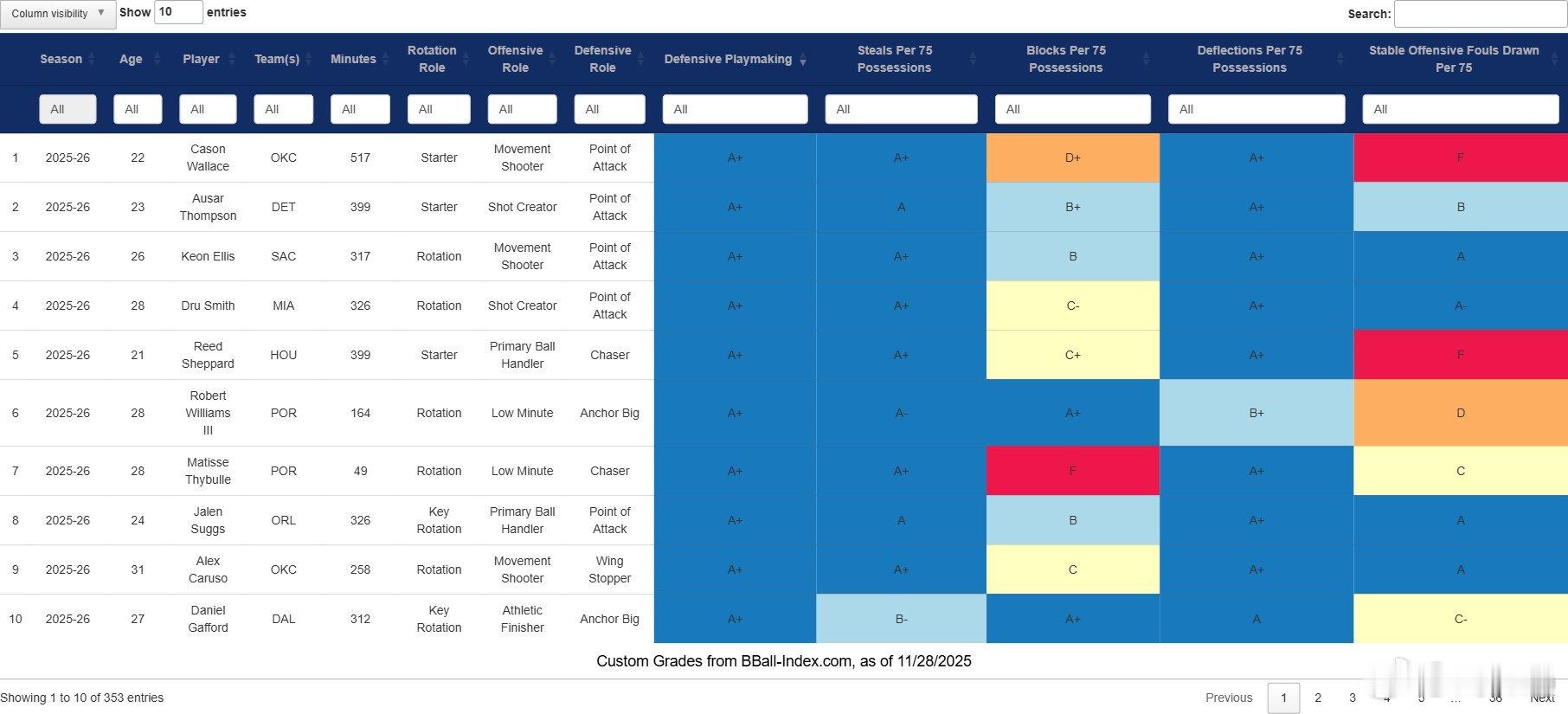NBA防守破坏力的前10👀该数据综合考量球员的盖帽、抢断、破坏传球以及造成进攻犯规的频次,并根据产生的防守价值进行加权计算。1. 卡森·华莱士2. 奥萨尔·汤普森3. 基翁·埃利斯4. 德鲁·史密斯5. 里德·谢泼德给斜坡的具体细分是(每75个回合)抢断 A+盖帽 C+干扰 A+造进攻犯规 F里德谢泼德休斯顿火箭
