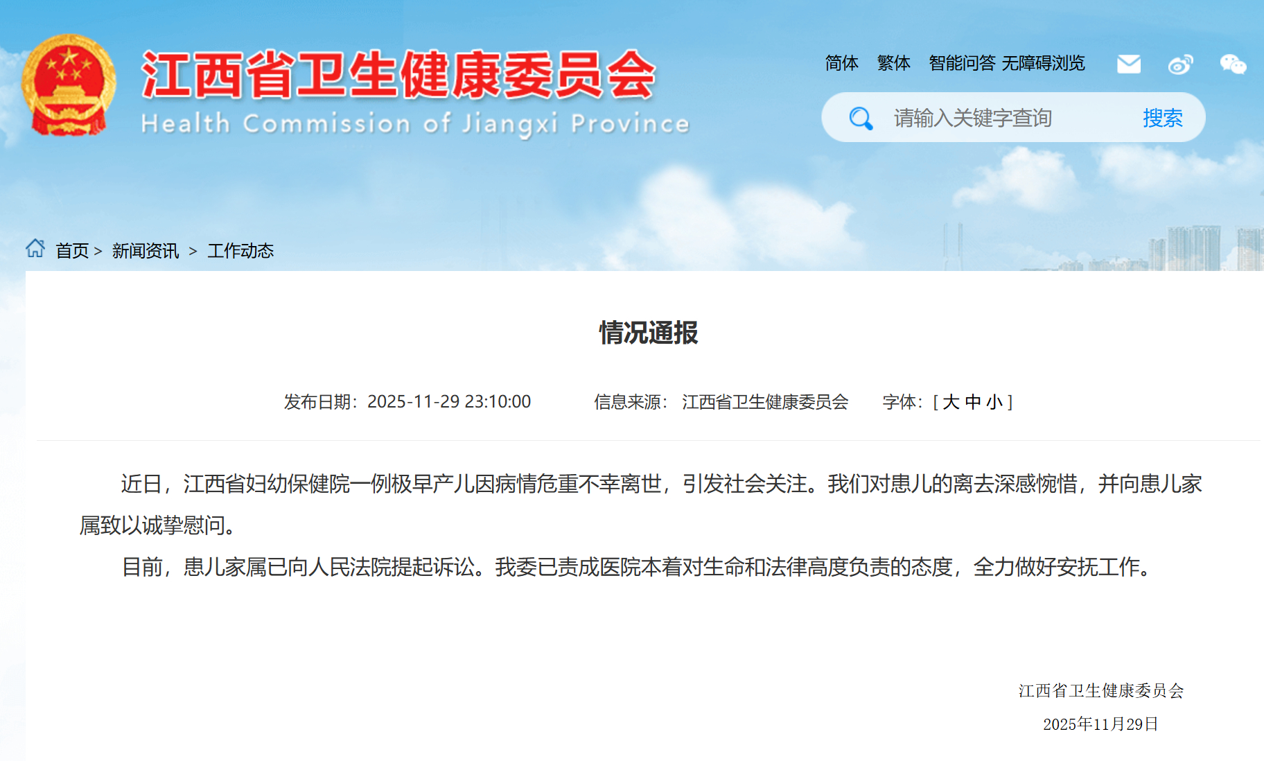 【#江西卫健委发布通报#】#江西早产离世患儿家属已向法院起诉# 据江西省卫生健康委员会网站:近日,江西省妇幼保健院一例极早产儿因病情危重不幸离世,引发社会关注。我们对患儿的离去深感惋惜,并向患儿家属致以诚挚慰问。目前,患儿家属已向人民法院提起诉讼。我委已责成医院本着对生命和法律高度负责的态度,全力做好安抚工作。#江西早产患儿因病情危重离世#