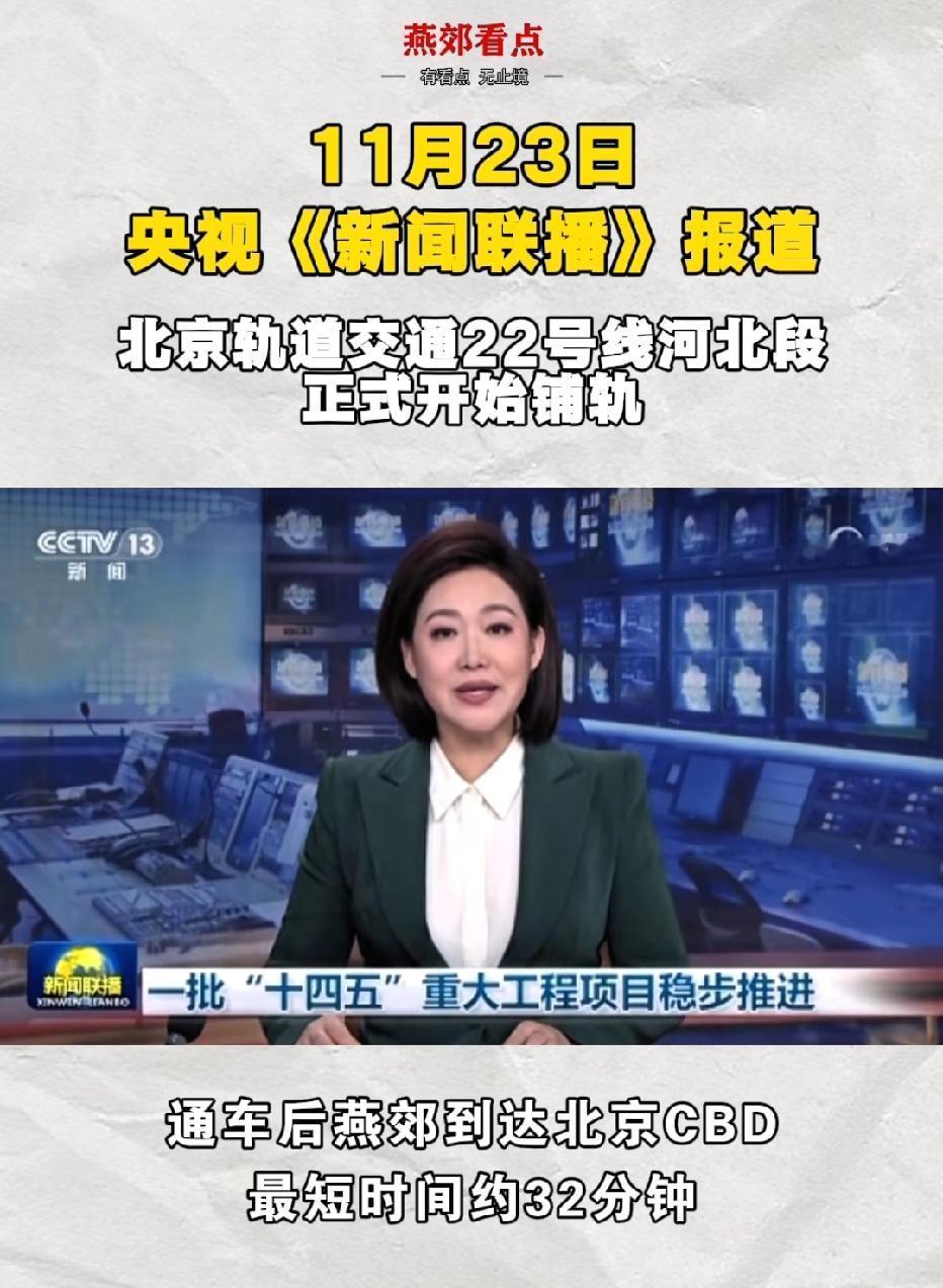 北京22号线最新进展! 根据10月23日央视报道,北京轨道交通22号线河北段正式开始铺轨,北京段8座车站的主体结构已全部完成,首列车已进入动态调试阶段,为全线通车按下“加速键”。 22号线是首条跨京冀的轨道交通线路,全长约81km,共设22个车站,串联北京CDB核心区、北京城市副中心、河北燕郊开发区及平谷新城等区域。 最最关键的是,通车后河北燕郊到北京CDB核心区通勤时间约32分钟,这大大缩短了通勤时间,对于在燕郊居住到北京上班的人来说简直是福音,再也不用长时间挤在通勤路上! 大家觉得22号线全线通车后,燕郊的房价会上涨吗?欢迎评论区留言,说说你的看法。北京22号线 跨京冀轨道