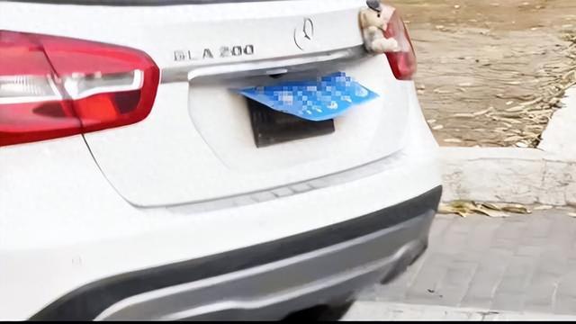后车牌下方的两个奔驰标志钉丢失,车牌已被掰成约60度角向上翘起变形。