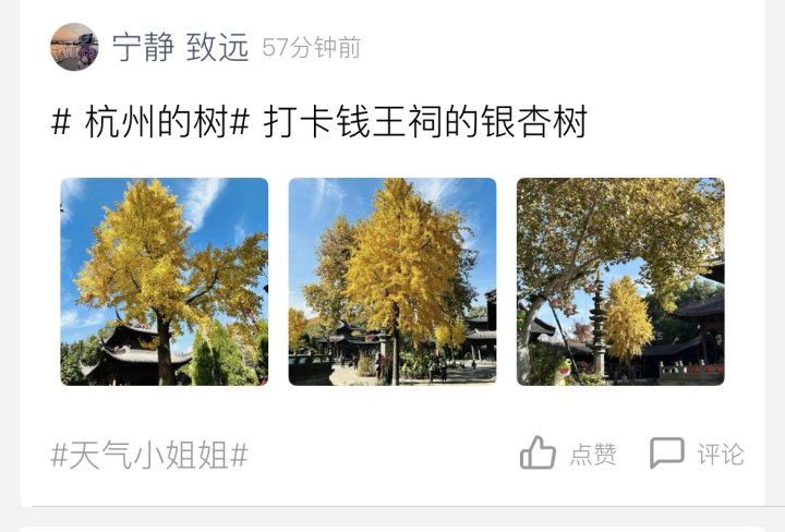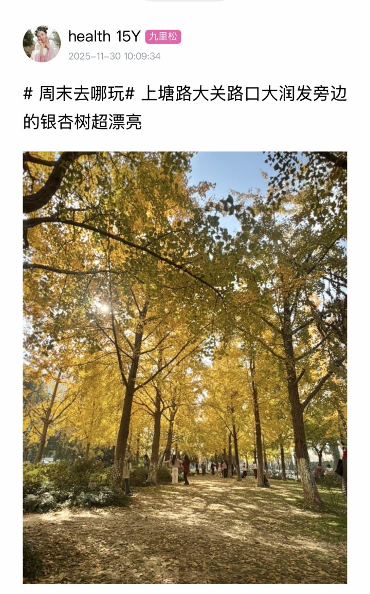 西湖的孤山上、西湖大道、环城北路、中河路上城段、拱墅区的贴沙河边等地,都是不错的银杏打卡地,趁着周日正好可以出门散个步,蹭蹭银杏的“金”光。