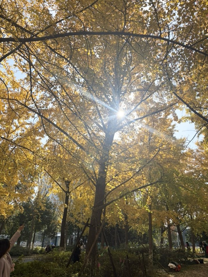 银杏叶含有较多的类胡萝卜素,随着天气转凉,叶绿素分解,类胡萝卜素占比增多,叶片因而会变成黄色,且温差越大,银杏叶愈黄愈艳丽。由于最近天气晴好,晴空辐射降温效应明显,昼夜温差达到了10~15℃,比如昨天最高气温有21.8℃,但最低气温仅有6.5℃。