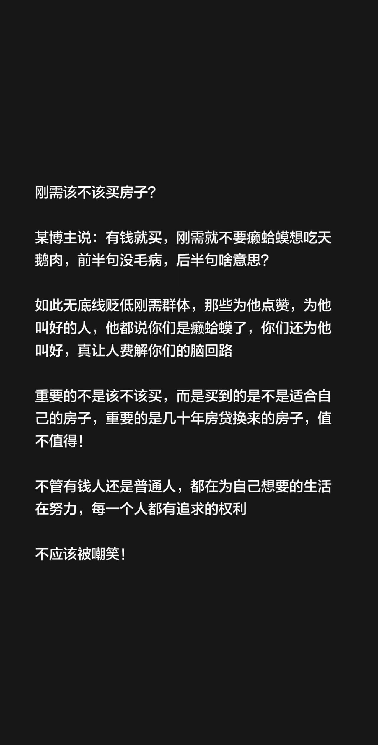 刚需该不该买房子?某博主说:有钱就买,刚需就不要癞蛤蟆想吃天鹅肉,前半句没毛病,后半句啥意思?如此无底线贬低刚需群体,那些为他点赞,为他叫好的人,他都说你们是癞蛤蟆了,你们还为他叫好,真让人费解你们的脑回路重要的不是该不该买,而是买到的是不是适合自己的房子,重要的是几十年房贷换来的房子,值不值得!不管有钱人还是普通人,都在为自己想要的生活在努力,每一个人都有追求的权利不应该被嘲笑!