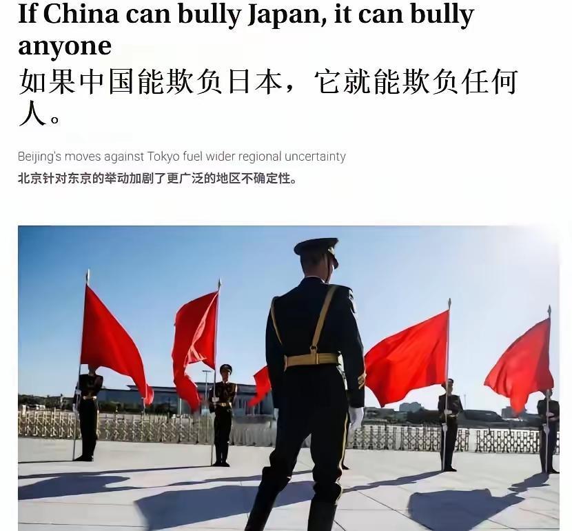 日本主流英文媒体《日本时报》称,“如果中国能欺负日本,它就能欺负任何人”。 《日本时报》的意思是日本比任何其他国家都强大,中国能欺负日本就能欺负所有人。 日本人用把自己描绘成强大国家的样子在制造恐慌,在挑拨离间。中国“欺负日本”是因日本缺少“教育”进而冒犯中国所应该得到的。这与其他国家没有任何关系。它的挑拨没有任何意义。 我们的反击是应该告诉世界,日本连自己的文化养母都侵略、屠杀的日本,还有谁它不敢侵略和屠杀?事实上,包括美国、英国还有澳大利亚的军人在二战时都曾被日本军人屠杀和虐待,其中还包括澳大利亚女性。应该无情地揭露它。