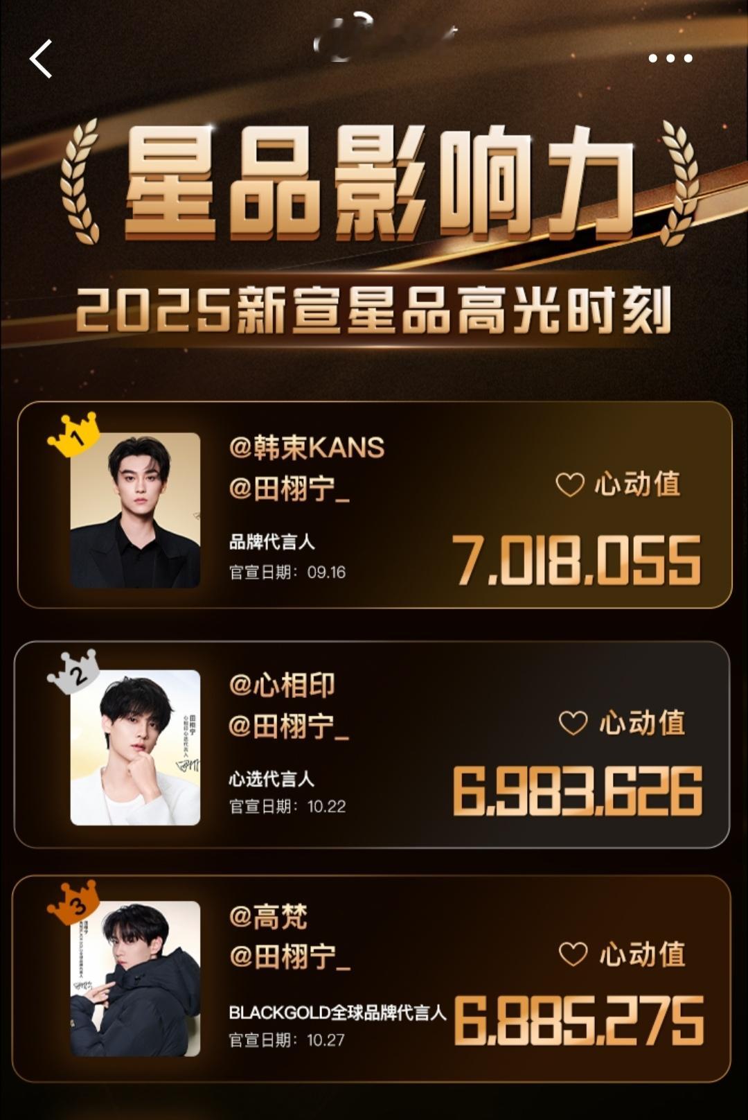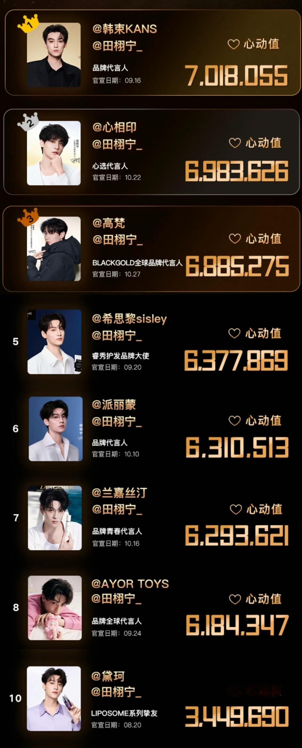田栩宁星品霸榜前三田栩宁2025新宣星品高光榜前十占八霸榜前三🔥八个商务代言全部上榜!田栩宁2025星品高光榜前十占八