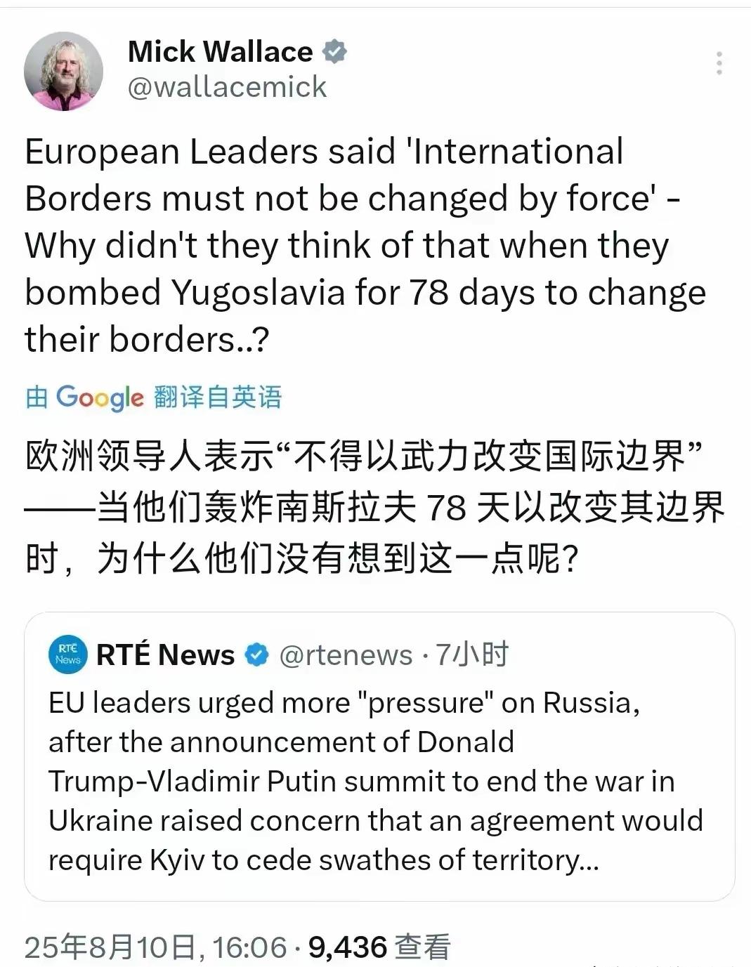 欧洲议会议员米克.华莱士今天(11月30日)转发古巴外长帕里利亚关于“谴责美国政府关闭委内瑞拉领空〞的发文后写道:“欧盟是否有勇气谴责这种公然违反国际法的行为?还是说,在欧盟看来,它的‘志同道合的伙伴美国’就像以色列一样,凌驾于法律之上?” 欧洲不是没有明白人,他们只是装糊涂。欧洲领导人口口声声说不得以武力改变国际边界,华莱士发文指出,“当他们轰炸南斯拉夫78天以改变其边界时,为什么他们没想到这一点”(图3)?现在美国公然封闭委内瑞拉领空,严重违反国际法,国际社会谴责声一片,但是欧盟却在装聋作哑。德国前总理舒尔茨曾经指出,全球南方国家质疑的不是国际规则,而是西方的双标,他们期待的是平等的代表权,以及西方双标的终结。