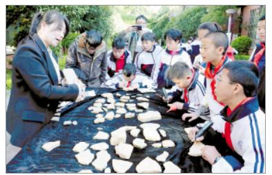 地质科普走进民大附中,专业人员向学生讲解化石标本修复。记者杨艳辉摄