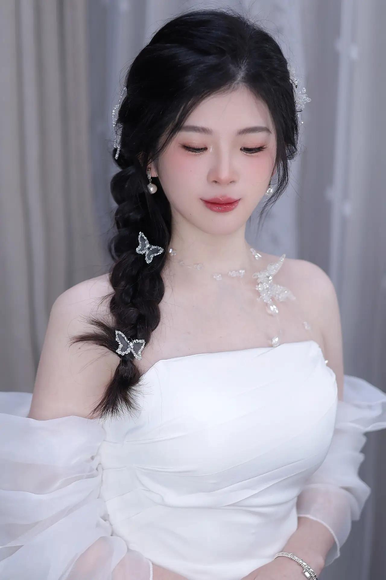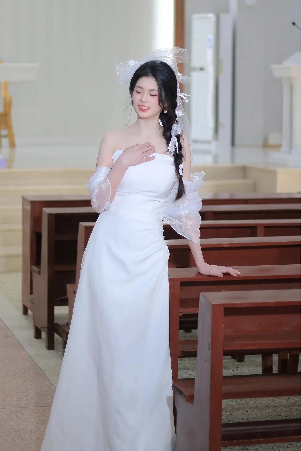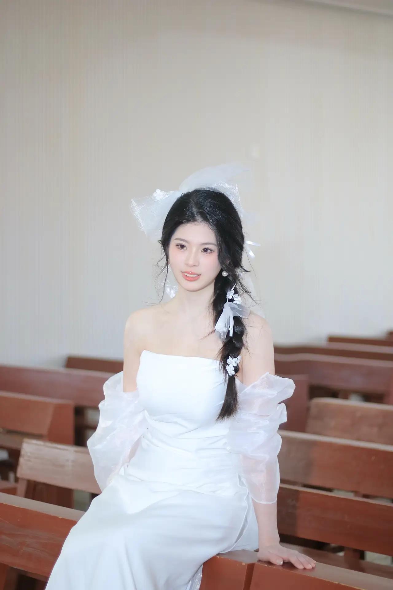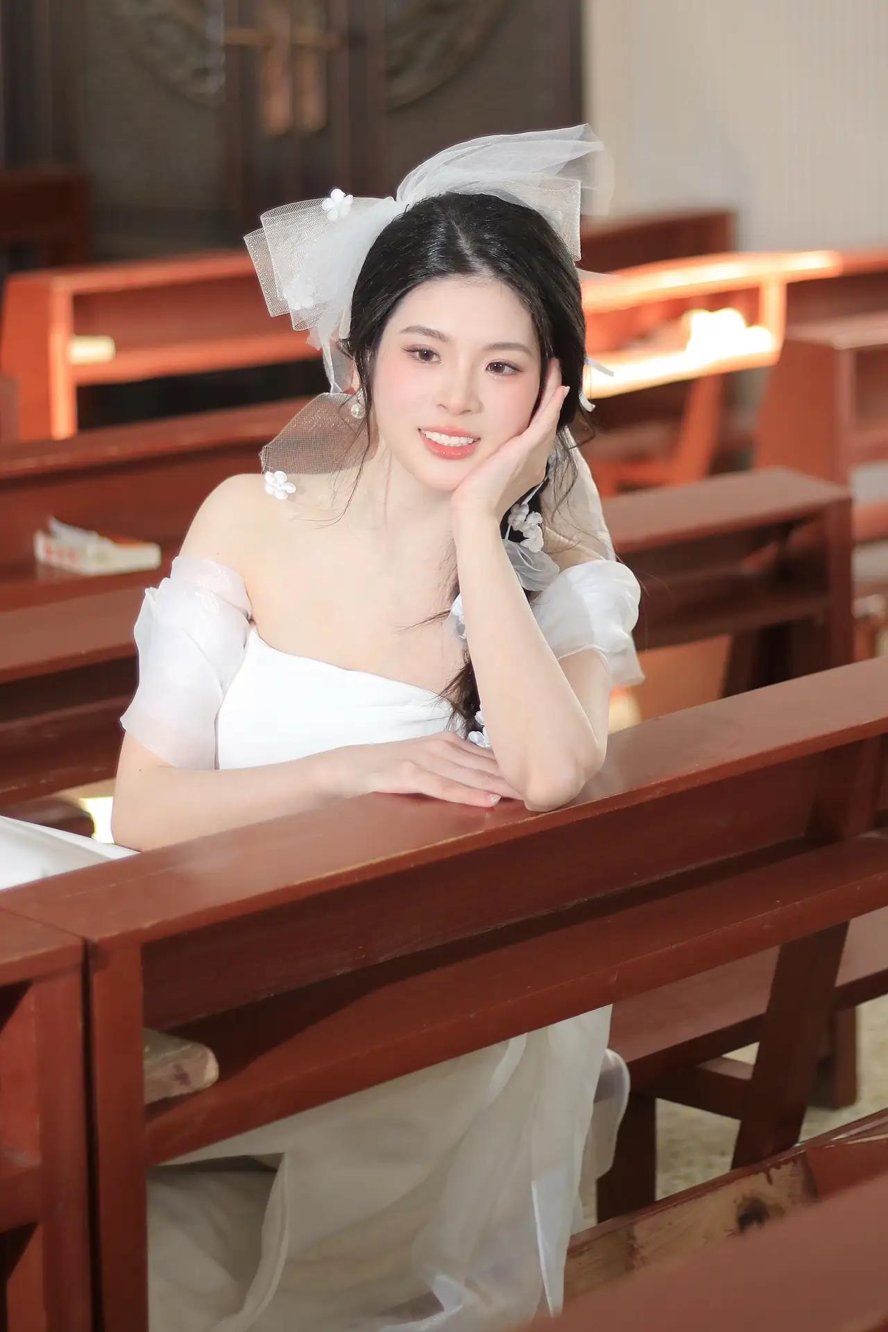 午后的阳光穿过教堂彩绘玻璃,在旋转楼梯上洒下斑斓的光斑。新娘坐在第三级台阶,蕾丝裙摆如云朵般铺展在深胡桃木台阶上,头纱上的铃兰与珍珠随着她整理手套的动作轻轻颤动。象牙白绸缎礼服在腰际收出流畅的弧度,鱼尾裙摆上的水晶刺绣折射出星芒,恰似她无名指上那枚钻戒闪耀的光晕。 "要帮我看看头纱有没有歪吗?"她仰头时,颈间钻石项链滑过锁骨,与耳垂上的珍珠耳钉形成温柔呼应。透明薄纱手套包裹的指尖抚过胸前的立体玫瑰,忽然想起母亲婚礼相册里那张泛黄照片——三十年前的同款手套,此刻正静静躺在她的首饰盒底层。 楼梯转角处的绣球花束沾着晨露,紫色花瓣与背景墙的莫兰迪色柱体相映成趣。当风掀起头纱边缘,六岁的小花童从廊柱后探出头,攥着满天星花篮的手指微微发颤。新娘转身的刹那,二楼管风琴流淌出《婚礼进行曲》的前奏,惊起落在窗台的白色蝴蝶,穿过花廊消失在夏日晴空里。 镜面墙映出她起身时裙摆泛起的涟漪,二十米长的拖尾扫过台阶上散落的玫瑰花瓣。当水晶鞋跟叩响大理石地面,婚纱内衬的暗纹提花掠过阳光,浮现出母亲亲手绣的希腊回纹——这是两代人关于幸福的密码,此刻正在时光褶皱里轻轻舒展。