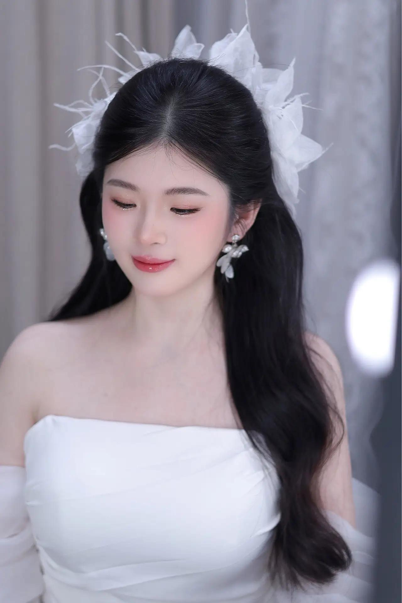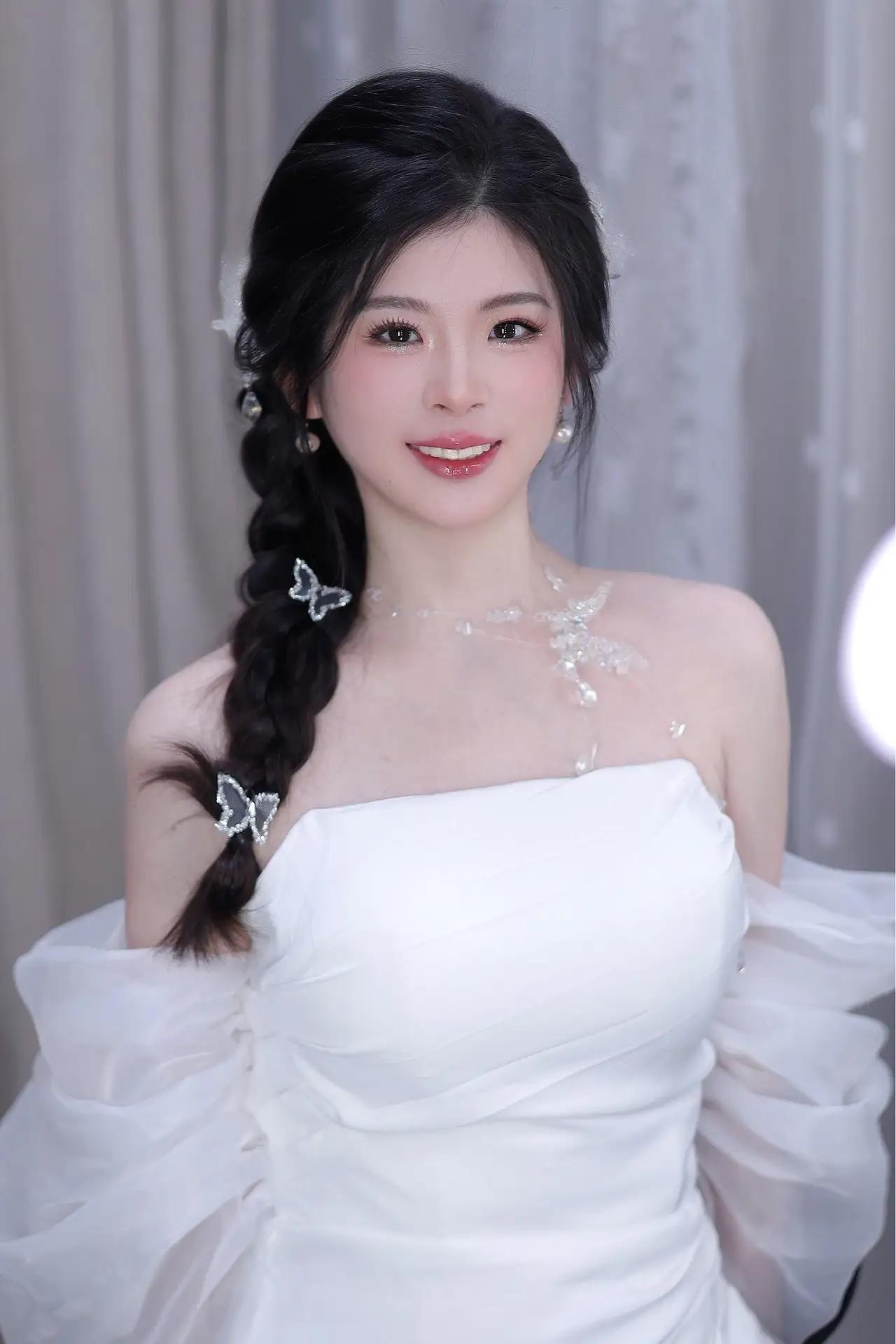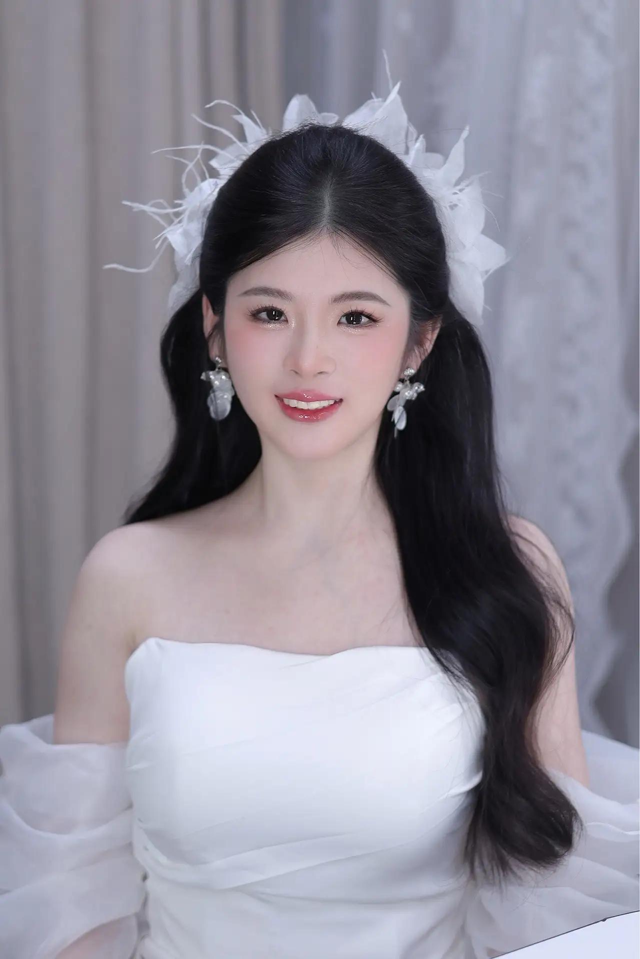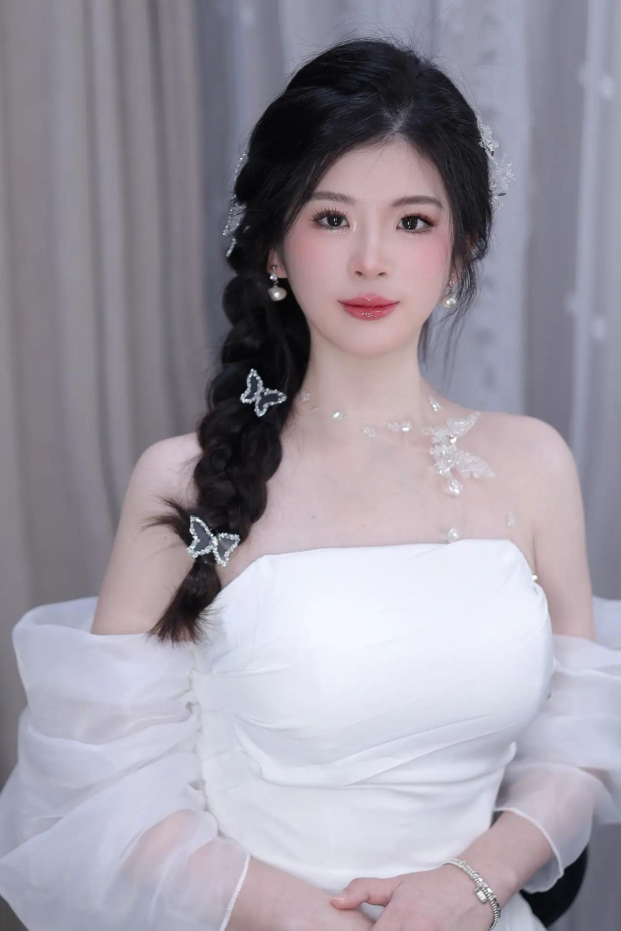 午后的阳光穿过教堂彩绘玻璃,在旋转楼梯上洒下斑斓的光斑。新娘坐在第三级台阶,蕾丝裙摆如云朵般铺展在深胡桃木台阶上,头纱上的铃兰与珍珠随着她整理手套的动作轻轻颤动。象牙白绸缎礼服在腰际收出流畅的弧度,鱼尾裙摆上的水晶刺绣折射出星芒,恰似她无名指上那枚钻戒闪耀的光晕。 "要帮我看看头纱有没有歪吗?"她仰头时,颈间钻石项链滑过锁骨,与耳垂上的珍珠耳钉形成温柔呼应。透明薄纱手套包裹的指尖抚过胸前的立体玫瑰,忽然想起母亲婚礼相册里那张泛黄照片——三十年前的同款手套,此刻正静静躺在她的首饰盒底层。 楼梯转角处的绣球花束沾着晨露,紫色花瓣与背景墙的莫兰迪色柱体相映成趣。当风掀起头纱边缘,六岁的小花童从廊柱后探出头,攥着满天星花篮的手指微微发颤。新娘转身的刹那,二楼管风琴流淌出《婚礼进行曲》的前奏,惊起落在窗台的白色蝴蝶,穿过花廊消失在夏日晴空里。 镜面墙映出她起身时裙摆泛起的涟漪,二十米长的拖尾扫过台阶上散落的玫瑰花瓣。当水晶鞋跟叩响大理石地面,婚纱内衬的暗纹提花掠过阳光,浮现出母亲亲手绣的希腊回纹——这是两代人关于幸福的密码,此刻正在时光褶皱里轻轻舒展。