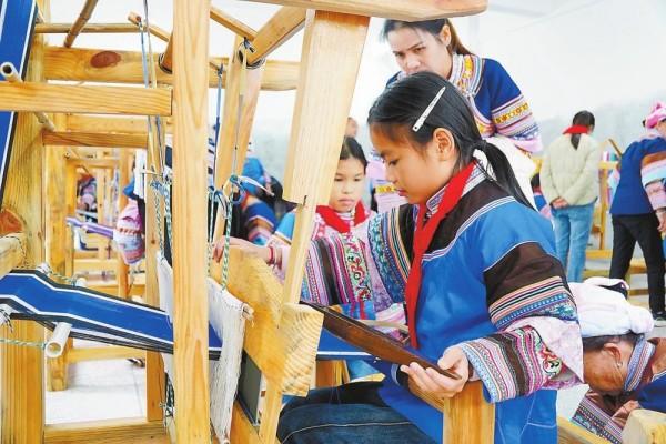 在师宗县五龙壮族乡中心完全小学的壮锦室里,10台崭新的织布机整齐排列,彩色的纬线在阳光下泛着柔和光泽,织布机的“唧唧”声与孩子们的欢声笑语此起彼伏,彩色纬线在稚嫩的手中穿梭,同学们不仅能够欣赏精美的壮锦作品,还能在绣娘的指导下亲手体验编织,并将自己的作品在专属展区展示。