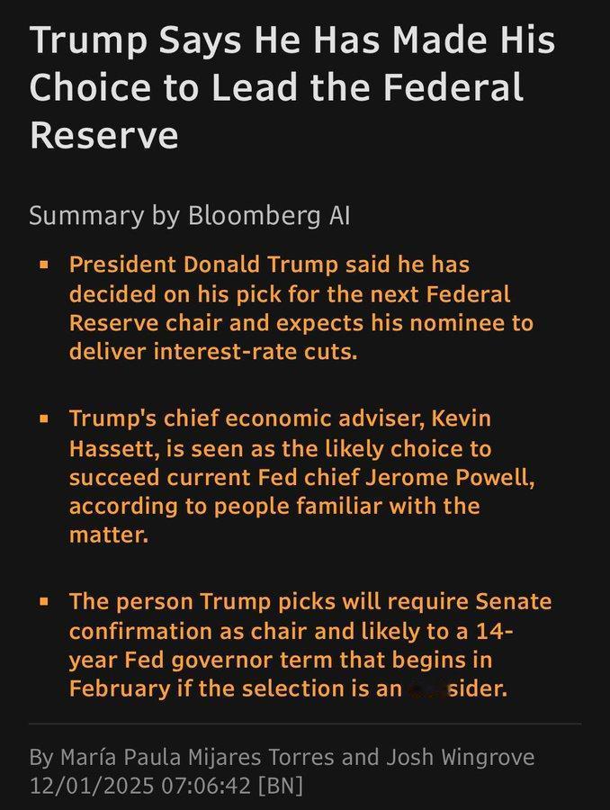 特朗普放话,联储新掌门已有人选,马上揭晓——这是把原定月底的“彩蛋”提前开封?眼下呼声最高的,是他的贴身经济顾问哈塞特:一位高举大幅降息大旗、立场与总统百分百同步的“自己人”。但我看来,更合适的其实是沃勒:中性偏鸽,理性不冒进,肯听市场说话,也讲逻辑。关键是,他上任能让大家相信,联储还不至于彻底放飞自我。当然,这些都是我们键盘猜想,最后拍板还得看特朗普。 别忘了,鲍威尔已确定12月1日交棒,消息称他会在周一晚七点(美东时间)的紧急会议上正式宣布。