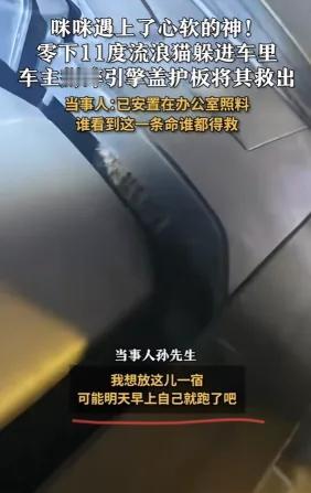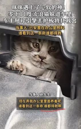 太有人情味了!吉林省吉林市,在零下11℃的严寒中,一只流浪猫为了取暖,钻进了一辆车的引擎,车主上车时发现了小猫,怕启动车辆会伤害它,于是立马掰碎引擎盖,小心翼翼地将小猫救出。网友:遇上了心软的神! 这车主孙先生是真敞亮!换旁人说不定嫌麻烦,要么直接启动车子,要么不管不顾开车走,哪会特意为了一只小野猫,把好好的引擎盖塑料护板掰碎。要知道那护板修起来不得花钱,但孙先生一句话说得实在:“这是条命,谁看到都得救”。 零下11度的天,咱们裹着羽绒服都嫌冷,更何况这没家的小奶猫。它也是没办法,才拼了命往发动机舱里钻,那里残留的余温,就是它能抓住的唯一活命机会。可这地方也是真危险,发动机一启动,高速转的皮带、风扇,稍不注意就会把小猫伤得够呛,甚至连命都没了。 孙先生的做法是真稳妥,一开始听到猫叫没硬掏,怕小猫应激乱蹿伤了自己,先开着双闪把车开回家。第二天见小猫还在,才干脆掰碎护板救人,现在小猫已经被他养在办公室,再也不用挨冻受饿了。 其实冬天这种事真不少见,流浪猫狗为了取暖,总爱往车底、轮胎旁或者引擎舱里钻。有维修师傅说,小猫爪子容易抓坏线路,排泄物还可能影响发动机散热,对车子也不好。但反过来想,只要开车前多花几十秒,绕车走一圈,敲敲引擎盖、按按喇叭,就能提醒它们赶紧离开,既救了小动物,也能避免车子出故障。 咱们不用做多大的事,家里有不用的旧棉衣、泡沫箱,简单改改就是个保暖猫窝;出门开车前多留意一下,看到流浪动物别驱赶,给口干净水、剩饭菜,对它们来说就是天大的帮助。 善良从来都不是啥难事,就像孙先生这样,宁愿自己多花点钱修车子,也不愿伤着一条小生命。这种发自内心的柔软,才是最能暖透人心的东西。 各位读者你们怎么看?欢迎在评论区讨论。你喂的流浪猫有消失不见的吗? 呼吸机拔管后多久能恢复正常