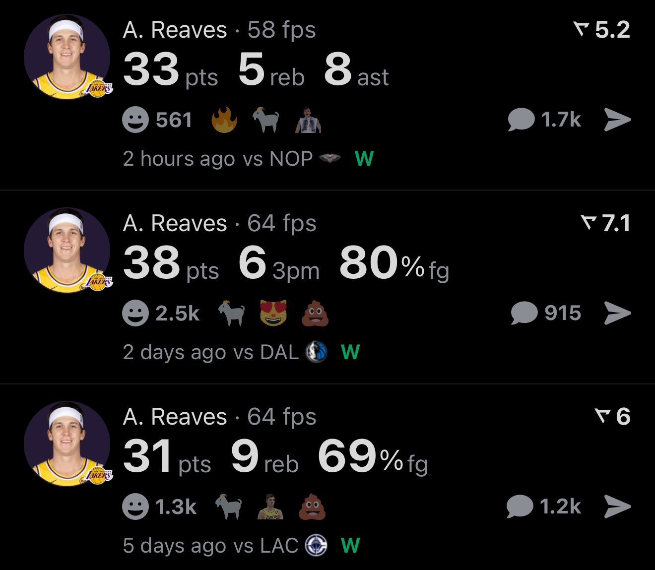 NBA历史上仅有的两位后卫球员,能够连续三场比赛得分超过30分,且真实命中率超过80%:— 斯蒂芬·库里— 奥斯汀·里夫斯湖人7连胜