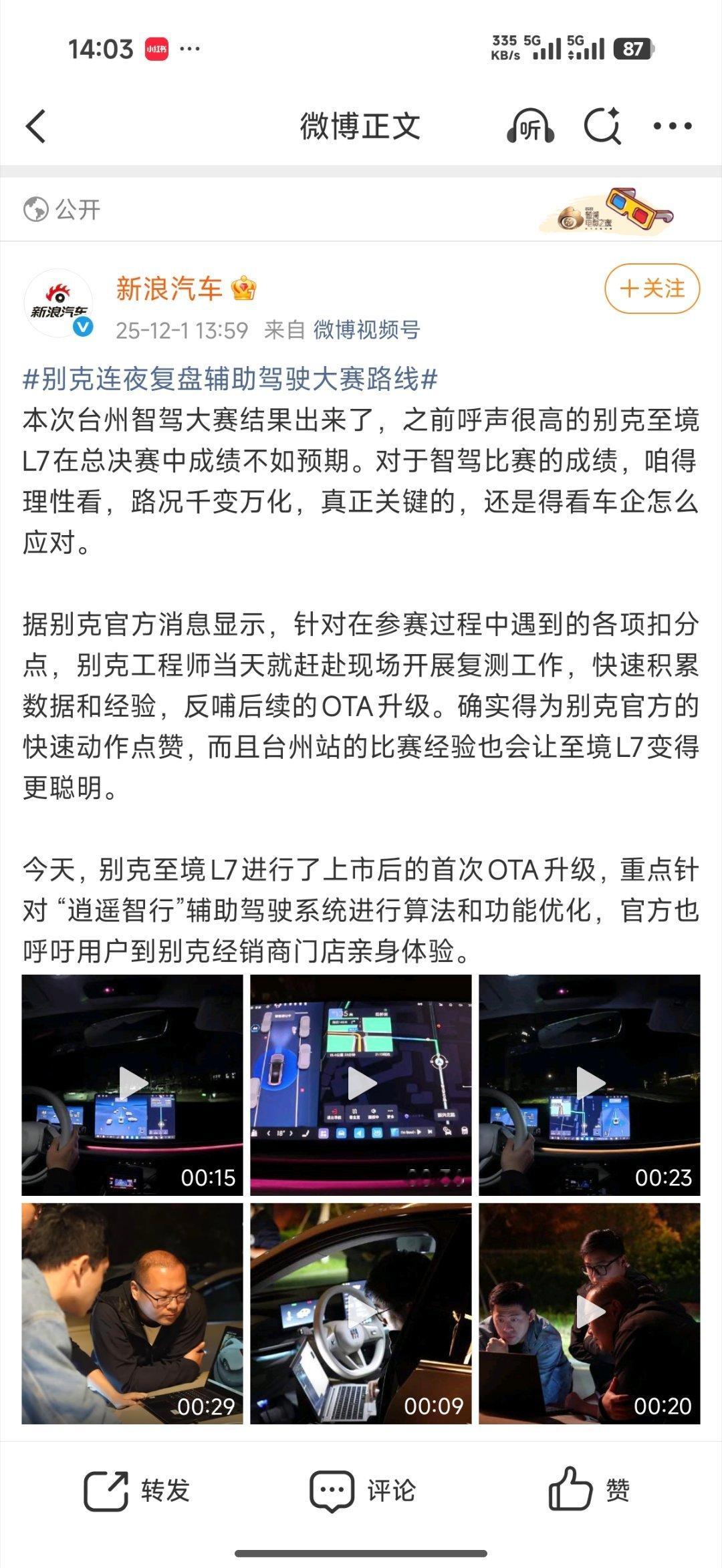 别克连夜复盘辅助驾驶大赛路线虽然这次别克至境l7成绩没有之前想象中好,但是别克工程师态度确实到了,连夜复盘,比起某些厂商成绩不好就骂人可以说天壤之别,态度好的让人有一点点感动接下来我来给大家科普一下这次智驾赛内容,以及分析一下为什么别克这次成绩不够好这次50城智驾挑战赛台州站的赛制设计可谓前所未有的严苛。赛事首次采用预决赛制,这一重大调整源于参赛车辆数量的激增——近3站都有17台车参赛,导致比赛时间过长 。预赛阶段,同一智驾方案商的多个车型进行内部竞争,每个方案选出一个冠军车型进入决赛 。别克至境L7在11月29日的预赛中表现抢眼,在Momenta系小组赛中,面对智己LS6、腾势N7、仰望U7等强劲对手,以109.55分的成绩夺得冠军。根据赛事数据,该车在NOA安全项仅扣8分,NOA效率项扣2分,凭借全程零接管的表现获得5分加分,完赛得分4.55分,完赛时间56分钟 。然而,决赛的挑战远超预赛。决赛路线涵盖了社区窄路、乡村道路、施工路段、环岛、市集道路、人造障碍物等多元城市交通场景。特别是4号考点的市集极窄路环境,路边车辆占道进一步压缩通行空间,重点考验车辆的窄路会车决策、避让绕行及空间感知能力,通过率仅30%。6号考点设置的动态障碍物挑战更是难上加难,在紧邻椒江的和合大道上布置的三个白色气球,受江边风力影响,气球高度较低且处于动态晃动状态,对车辆的障碍物识别精度、动态轨迹预测及应急响应速度提出极高要求,通过率仅20%。别克至境L7在决赛中存在3次压实线、两次走错路、1次右转掉头不通过、2次博弈失败,实际接管5次应扣22分,但最终结果却是接管2次扣13分令人意外的是,决赛冠军星纪元ES以112.81分的成绩实现了全程零接管,小米YU7以104.64分获得亚军,阿维塔07以102.81分获得季军 。这些车型在相同的赛道上展现出了截然不同的技术实力,特别是星纪元ES,其在重庆复杂路况测试中曾实现5层20匝道全程零接管的壮举 。别克至境L7全球首发Momenta R6飞轮大模型,这是国内首个在端到端架构上实现量产落地的强化学习大模型 。在硬件和技术层面是很强的然而,技术优势并不等同于实际表现。在台州站决赛中,别克至境L7的Momenta R6方案暴露出了明显的适应性问题。特别是在面对未披露路线的复杂场景时,其"端到端"决策模式的优势未能充分发挥,反而在某些场景下出现了路线偏离、决策迟缓等问题。按照工程师的说法,这次最大的问题还是软件层面的问题,新方案理论很强,实际应用中却暴露出了系统协同的问题:1. 系统稳定性不足:在重庆解放碑地下环道测试时遇到信号盲区,导航突然断片导致智驾系统"发懵",连续错过了两个该转弯的路口。2. 识别能力有限:在李子坝轻轨站坡道起步时,前面有公交车遮挡视线,系统对突然出现的电动车识别慢了半拍,虽然最终刹住但急刹感明显。3. 环境适应性差:在南滨路江边雾气较大的环境中,系统把江面反光误判为障碍物,导致不必要的减速。4. 智驾功能受限:实际体验显示,该车智驾系统虽然配备了激光雷达与众多摄像头,但做不到自动变道和自动拐弯,只能按照标线行驶;绿灯起步迟疑约2秒,变道需要手动拨杆且迟疑3秒多 。这些问题表明,尽管Momenta R6在技术架构上具有先进性,但在实际场景适配、系统稳定性和功能完整性方面仍存在明显短板。虽然这次成绩不如预期,但可以预见的是,别克在未来必然是辅助驾驶头部玩家之一。最后引入一个思考题,奇瑞比亚迪别克都能在辅助驾驶比赛中大放异彩,辅助驾驶真的有护城河吗?