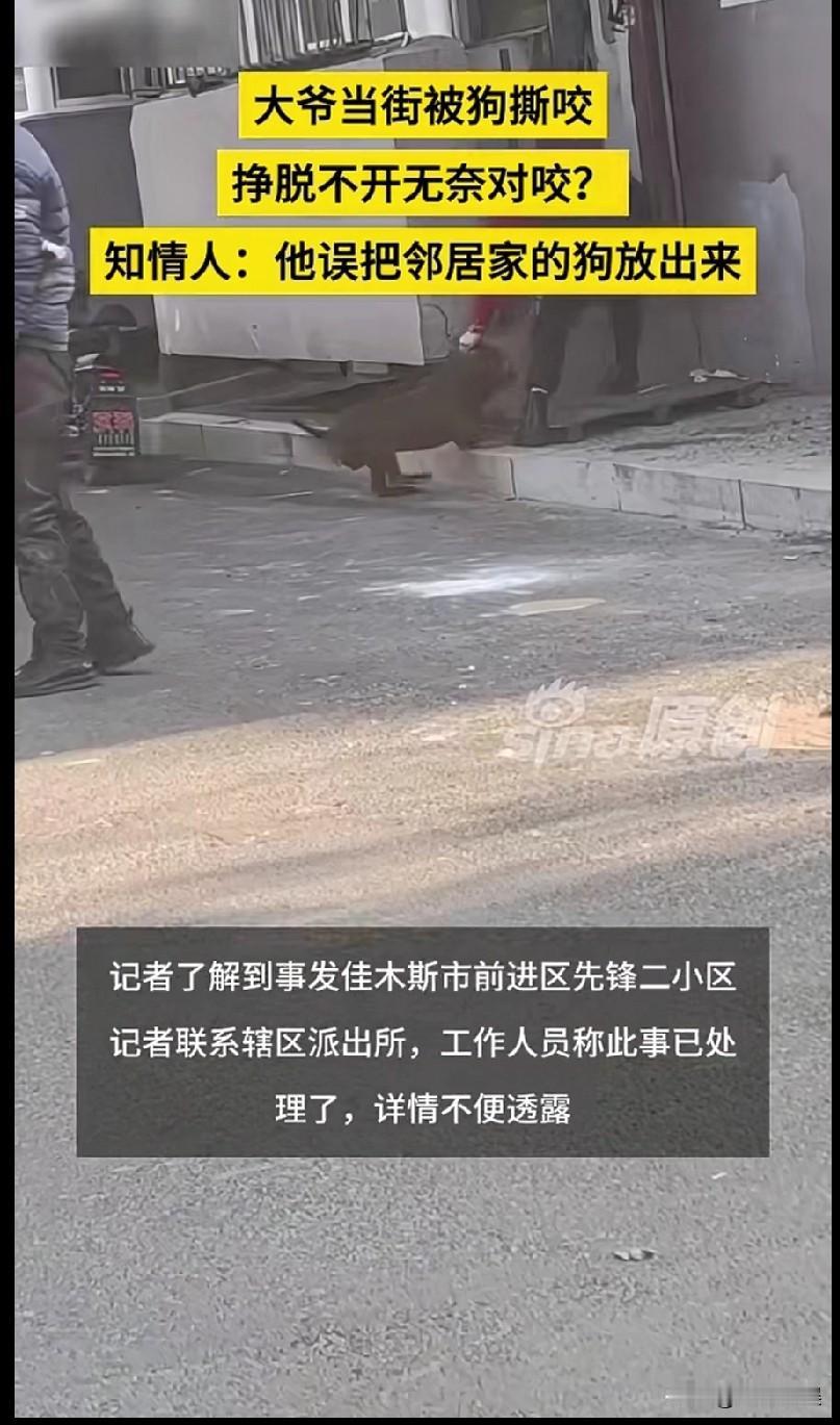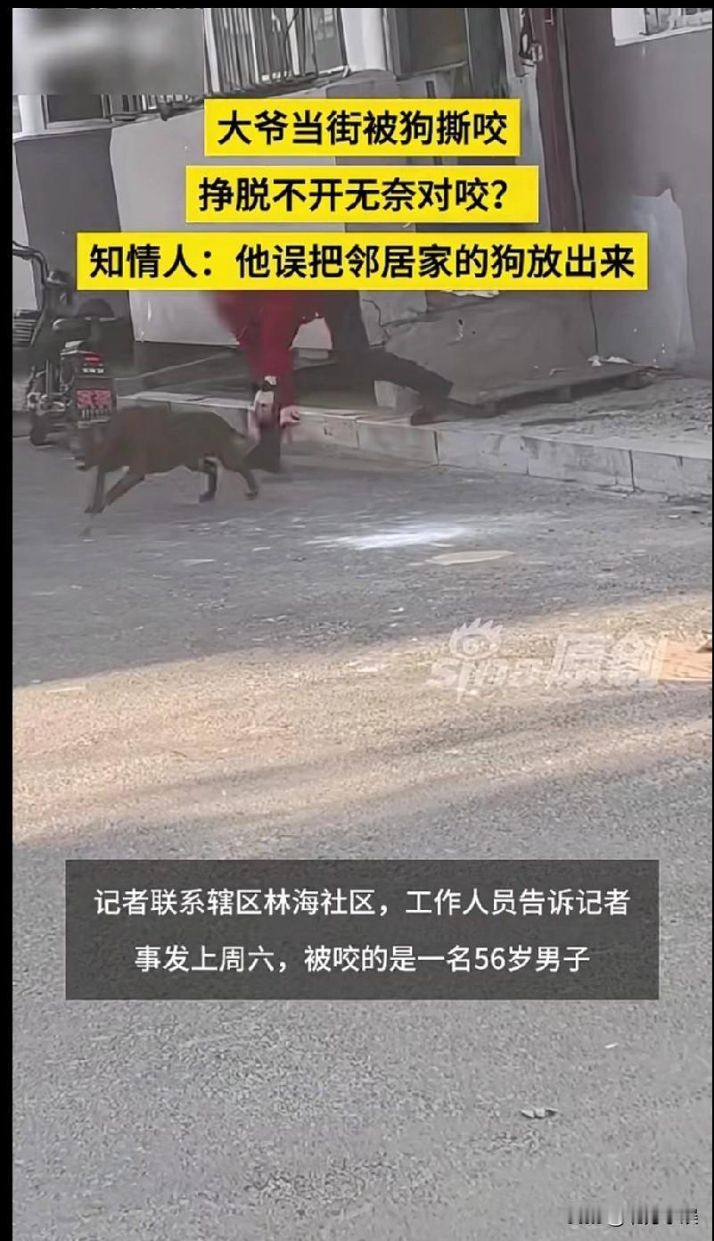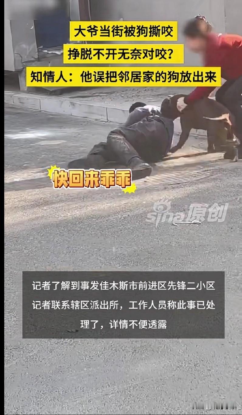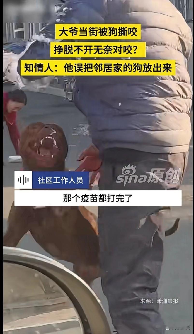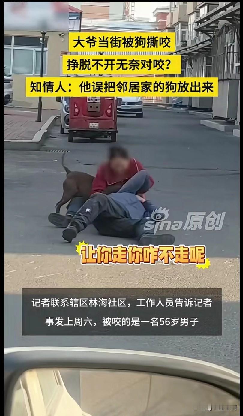 大爷在街上被狗撕咬,大爷挣脱不开,无奈与狗对咬! 大爷误把邻居家阳台的狗给放出来了,这个狗开始在街上撕咬大爷,大爷被扑倒在地,大爷挣脱不开,无法反击,无奈大爷也咬住了狗。后来大爷被一位女士给拉开了狗,女士把狗拉到了一边,但是大爷并没有马上离开,这时狗又从女子身边窜出去了,又去扑咬大爷,女士又追了过去尽力拉开,女子边拉边说:让你走你咋不走呢? 最后狗的主人对大爷进行了赔偿,也打了疫苗,据说伤势不是很重。 大爷虽然被咬的不严重,但是大爷肯定是吓的够呛! 有的网友说:大爷太恋战了,都拉开了,怎么不快点走啊? 大爷第一次被狗撕咬被拉开了,大爷就应该快点远离这个地方,如果马上离开的话,大爷就不会再次被咬,伤势就不会这么严重!这狗太吓人了!就应该禁止养大型犬和烈犬!