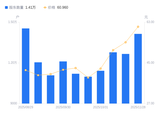 日期A股户数(户)流通A股户均持股数(股)户均持股市值(万元)2025-11-281413515094.4592.022025-11-201265916854.4191.172025-11-101278016694.8484.482025-10-311141818686.2879.342025-10-201097819435.2374.792025-10-101119319061.9181.392025-09-301210417627.2373.932025-09-191107719261.5377.082025-09-101204017720.9370.032025-08-291453814676.0261.30