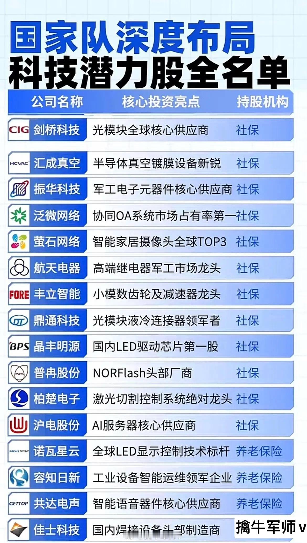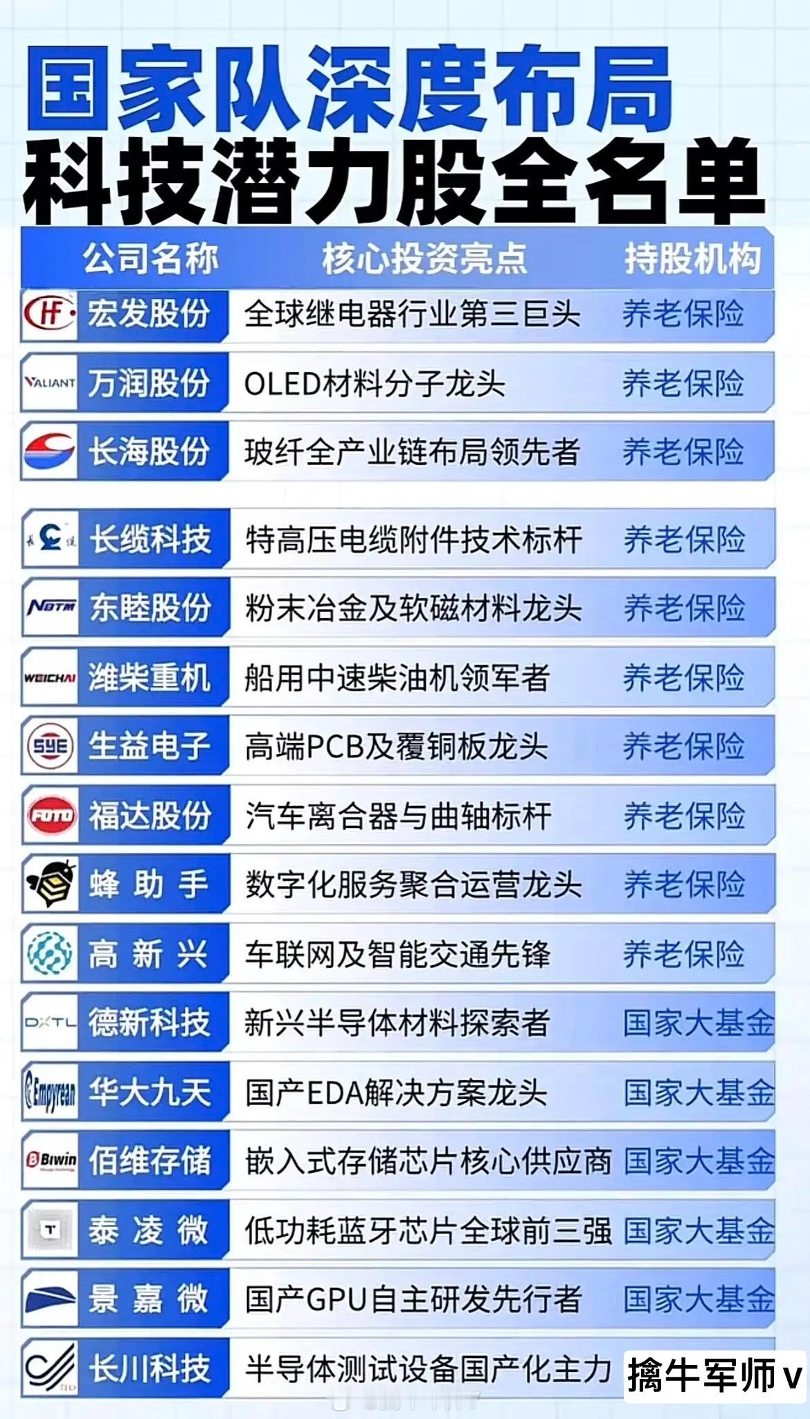 “国家队深度布局科技潜力股全名单”,系统梳理了多家在细分科技领域具备领先地位的企业及其投资价值。第一张图列出星网锐捷、三一重工、软控股份、巨力索具、浙数文化、海康威视等企业,核心亮点涵盖企业级网络设备国产化、全球工程机械电动化、橡胶机械全球前三、深海科技、数据中心运营、安防监控设备等方向,持股机构主要是中央汇金和社保基金。第二张图展示了15家科技公司,包括剑桥科技(光模块全球核心供应商)、汇成真空(半导体真空镀膜设备新锐)、振华科技(军工电子元器件核心供应商)、泛微网络(协同OA系统市场占有率第一)、萤石网络(智能家居摄像头全球TOP3)、航天电器(高端继电器军工市场龙头)、丰立智能(小模数齿轮及减速器龙头)、鼎通科技(光模块液冷连接器领军者)、晶丰明源(国内LED驱动芯片第一股)、普冉股份(NOR Flash头部厂商)、柏楚电子(激光切割控制系统绝对龙头)、沪电股份(AI服务器核心供应商)等,持股机构多为社保基金,少数为养老保险。第三张图聚焦养老保险与国家大基金持股的企业,包括宏发股份(全球继电器行业第三巨头)、万润股份(OLED材料分子龙头)、长海股份(玻纤全产业链布局领先者)、长缆科技(特高压电缆附件技术标杆)、东睦股份(粉末冶金及软磁材料龙头)、潍柴重机(船用中速柴油机领军者)、生益电子(高端PCB及覆铜板龙头)、福达股份(汽车离合器与曲轴标杆)、蜂助手(数字化服务聚合运营龙头)、高新兴(车联网及智能交通先锋),以及由国家大基金持股的德新科技(新兴半导体材料探索者)、华大九天(国产EDA解决方案龙头)、佰维存储(嵌入式存储芯片核心供应商)、泰凌微(低功耗蓝牙芯片全球前三强)、景嘉微(国产GPU自主研发先行者)、长川科技(半导体测试设备国产化主力)。整体来看,三张图从不同维度呈现了国家队(中央汇金、社保基金、养老保险、国家大基金)在科技领域的深度布局,覆盖网络通信、工程机械、半导体、安防、智能制造、新材料、新能源、军工电子、人工智能等多个前沿赛道,凸显出这些企业在各自细分市场的龙头地位与国产替代潜力。