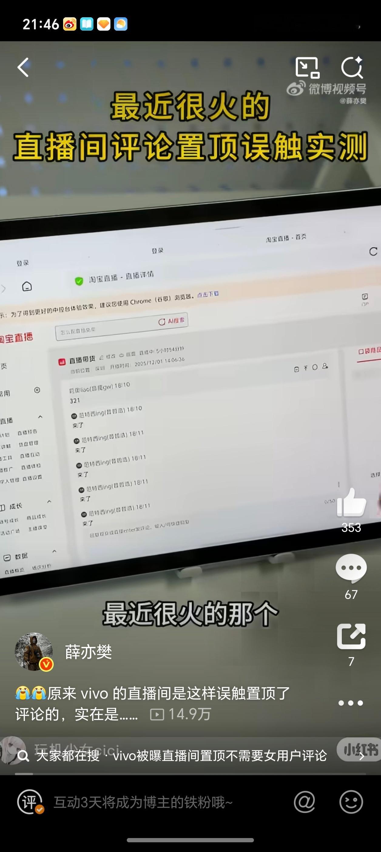 vivo回应直播间风波官方已经回应了,是误触!所以不要带节奏了!蓝厂是最宠爱女性