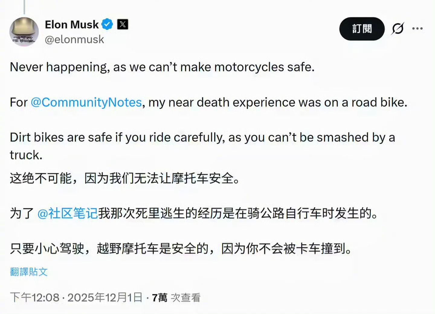 马斯克解释特斯拉为何不做摩托车无法确保安全,之前骑公路车差点命丧黄泉摩托车的危险系数确实高! 广州