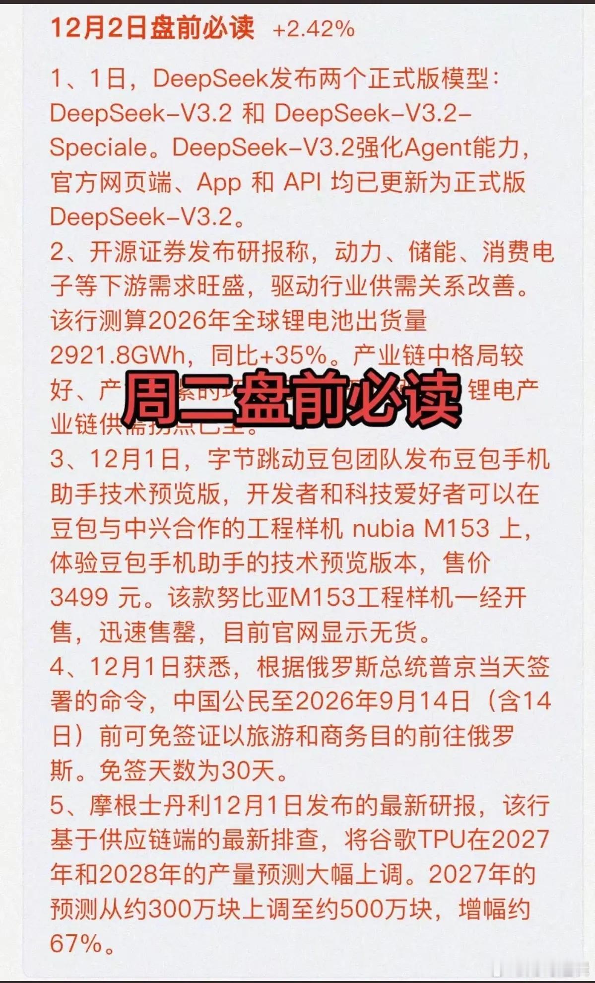 12月2日周二 盘前财经必读!1、1日,DeepSeek发布两个正式版模型: DeepSeek-V3.2和DeepSeek-V3.2-Speciale。2、开源证券发布研报称,动力、储能、消费电子等下游需求旺盛,驱动行业供需关系改善。 该行测算2026年全球锂电池出货量2921.8GWh,同比+35%。3、12月1日,字节跳动豆包团队发布豆包手机助手技术预览版,开发者和科技爱好者可以在豆包与中兴合作的工程样机nubia M153上, 体验豆包手机助手的技术预览版本,售价3499元。该款努比亚M153工程样机一经开售,迅速售罄,目前官网显示无货。 4、12月1日获悉,根据俄罗斯总统普京当天签署的命令,中国公民至2026年9月14日(含14 日)前可免签证以旅游和商务目的前往俄罗斯。免签天数为30天。 5、摩根士丹利12月1日发布的最新研报,该行基于供应链端的最新排查,将谷歌TPU在207 年和2028年的产量预测大幅上调。2027年的预测从约300万块上调至约500万块,增幅约67%。
