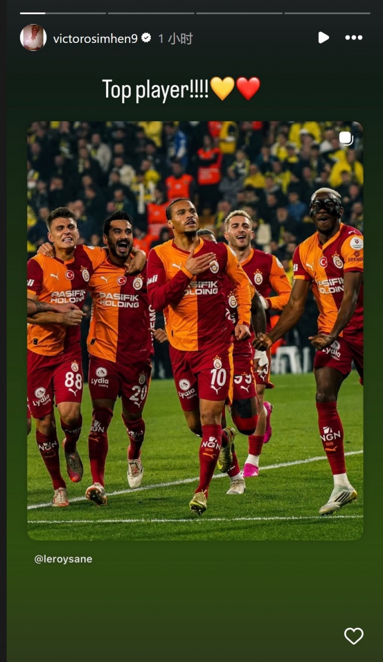 赛后奥斯梅恩社媒晒出萨内庆祝进球的照片,称赞队友的出色表现,配文:“顶级球员!”