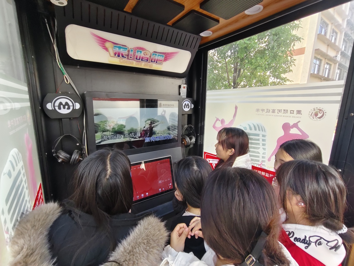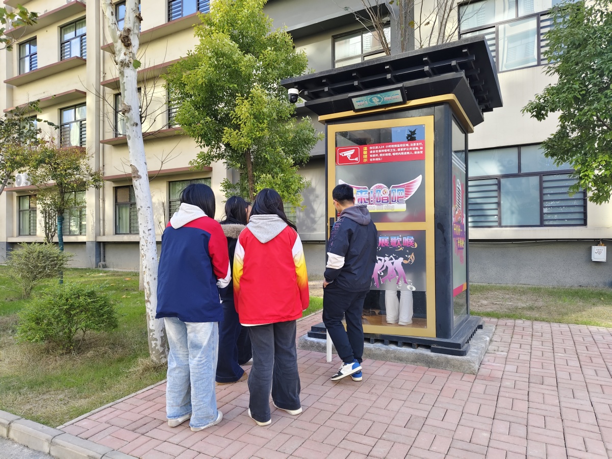 记者看到,校内KTV并不算大,只有过去的电话亭大小,里面设有点唱机,配备两个话筒和环声音响,而且听起来音质很不错。点唱机里有大约3000首歌曲,分为红色歌曲、流行音乐、地方民歌等。“我们买回来点唱机后,对歌单进行了筛选,不健康的歌曲严禁入列,3000首歌曲里,红色歌曲占到半数以上,其他都是大家知名的歌曲。”周口市颍河高中初中部校长刘超说。