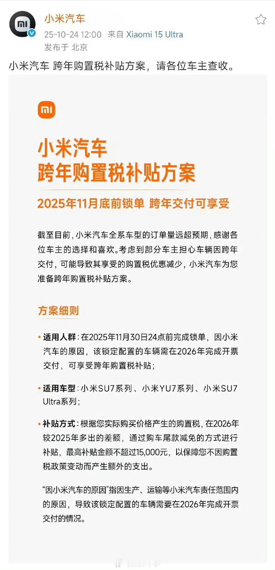 雷军发布小米购置税补贴重要提示 大概意思 ,2025年11月30日24点前锁单,2026年开票交付的用户,可以享受“跨年购置税补贴”
