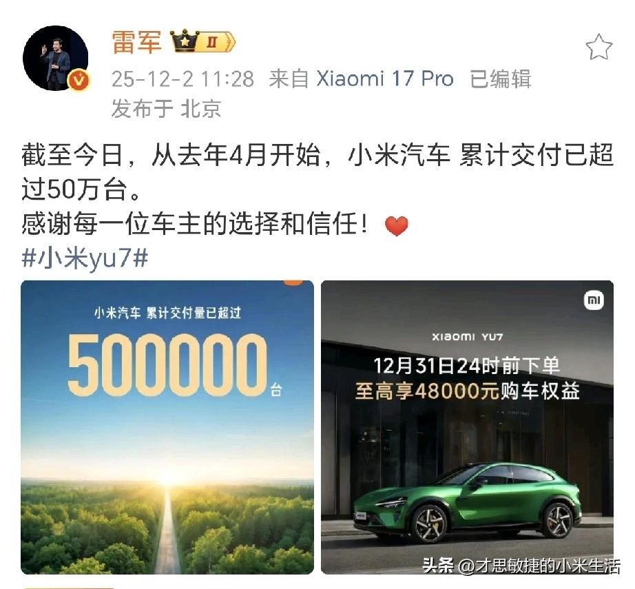 雷军刚刚突然发文感谢50万小米车主! 今天应该是雷总最高兴的一天了,从2024年4月3日到今天是2025年12月2日,小米汽车累计交付已超过50万台。提前完成2025年全年目标:35万台。10月11月连续两月交付量超过4万台。 小米汽车 第50万辆整车正式下产线。 从线下到交付只用了12天时间,小米汽车每月的产能再增加,销量也会增加!25年10月,小米YU7在国内SUV销量第一。近12个月,小米SU7在 20万以上轿车销量第一; 小米汽车将强大的产品力转化为销售奇迹,不仅满足了用户需求,更创造了市场趋势,从第一台到第 50 万台,用时不到 20 个月,小米创造了新纪录!真是应了那句话,都不看好你,偏偏瞧你最争气,小米汽车真是中国新能源汽车的骄傲和自豪,值得点赞!恭喜雷总!祝贺小米汽车!愿越来越好! 你们觉得呢?
