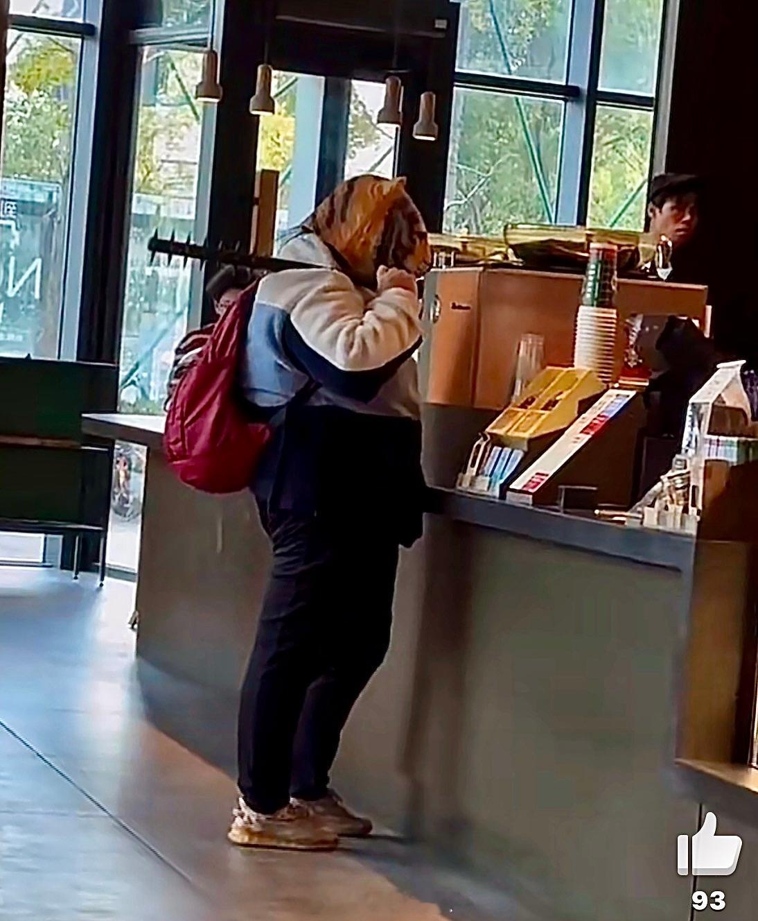 宁波星巴克惊现一人戴头罩持狼牙棒当时我就震惊了,我猜应该是哪个大网红在拍段子吧,怪吓人的