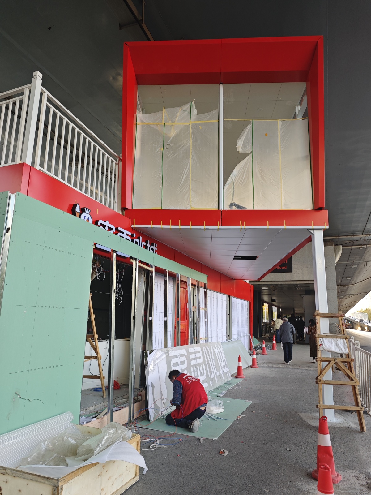记者到达时,现场的装修工作正在紧锣密鼓地进行中。从外观上看,整体的主体结构已经基本成型,红白配色的装饰风格十分具有辨识度。
