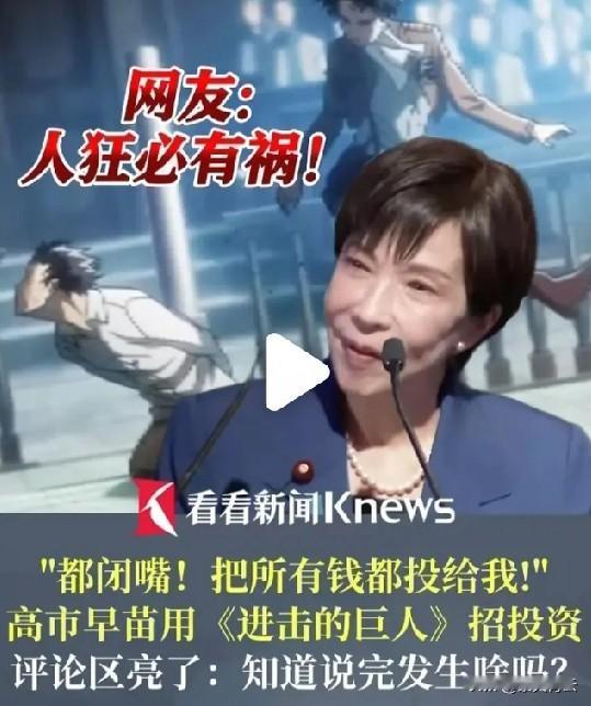 高市早苗用动漫台词招投资翻车,根本不是玩笑而是暴露硬伤!一边刚因涉台言论引发多国抗议,一边在投资峰会上说疯话,这种情绪化又不专业的表现,谁敢把钱投给她? 日本经济本就面临GDP萎缩、股债汇三杀的困境,急需外资救场,结果她不用正经政策打动投资人,反倒靠动漫台词耍嘴皮子。 网友辣评精准戳穿:“动漫里说完就挨揍,现实里投资人直接跑路”。连基本的外交礼仪和执政诚意都没有,这样的政客能带领日本走出困境?怕不是越帮越忙! 高市早苗引用《进击的巨人》台词翻车你咋看