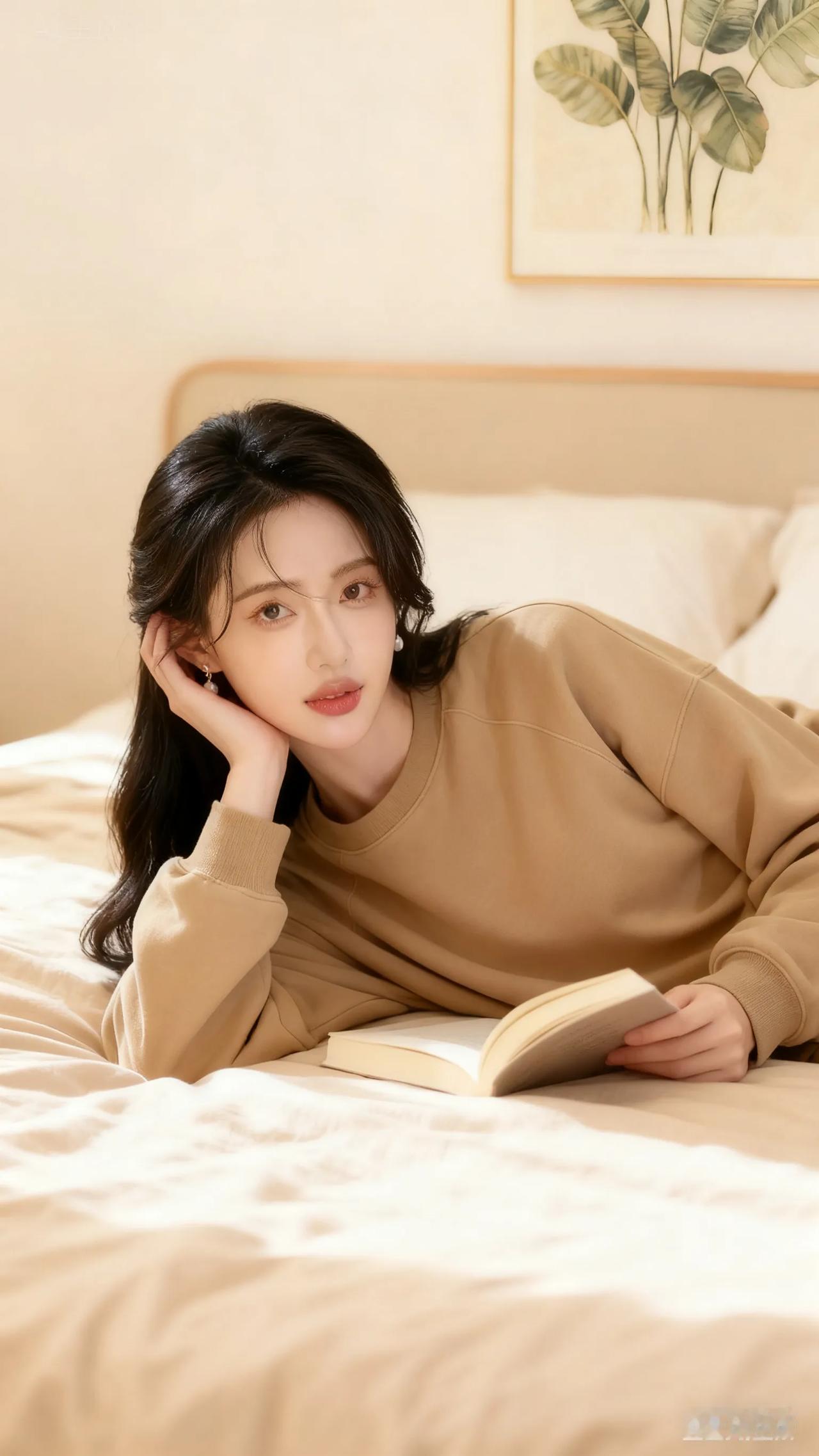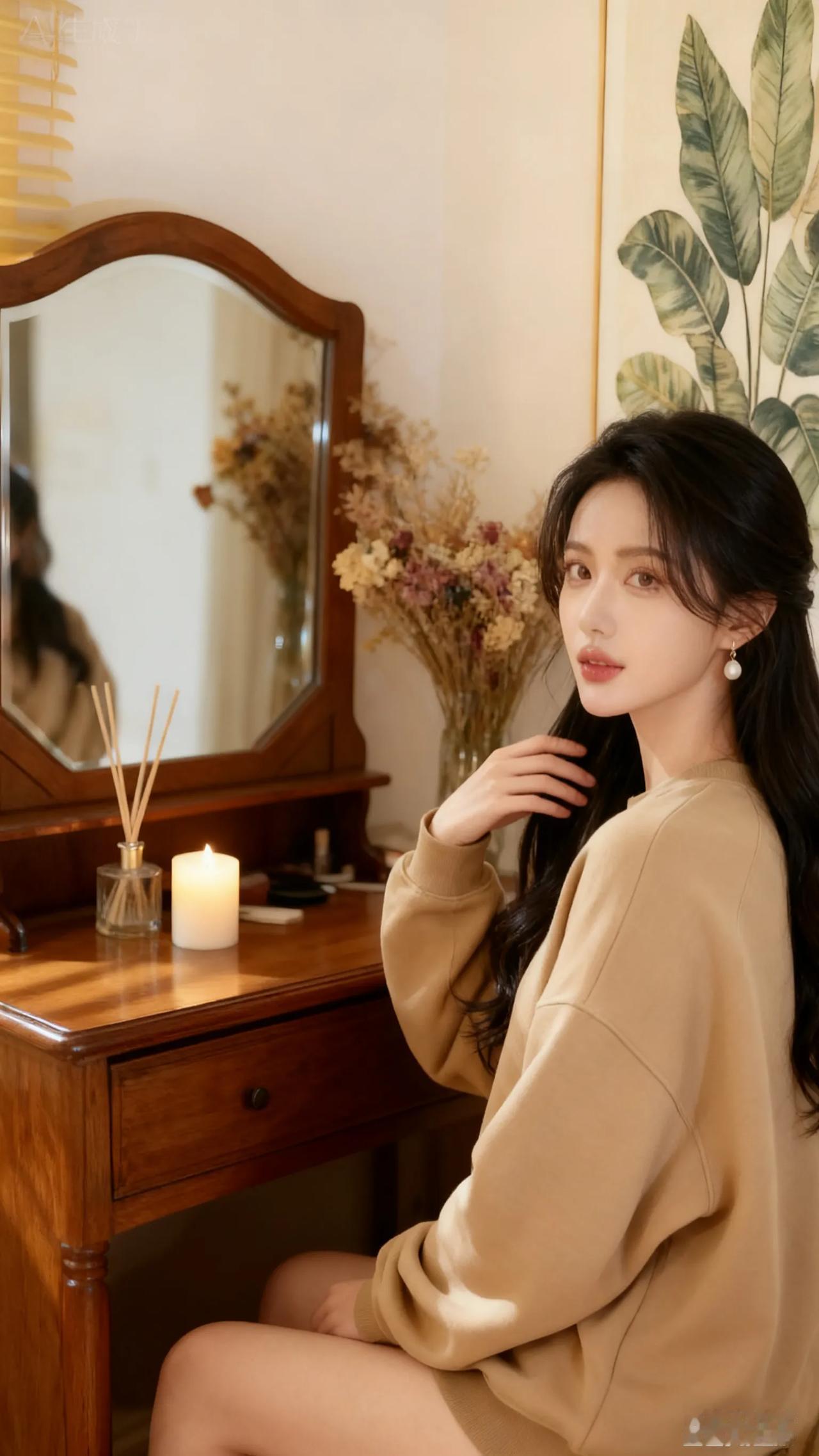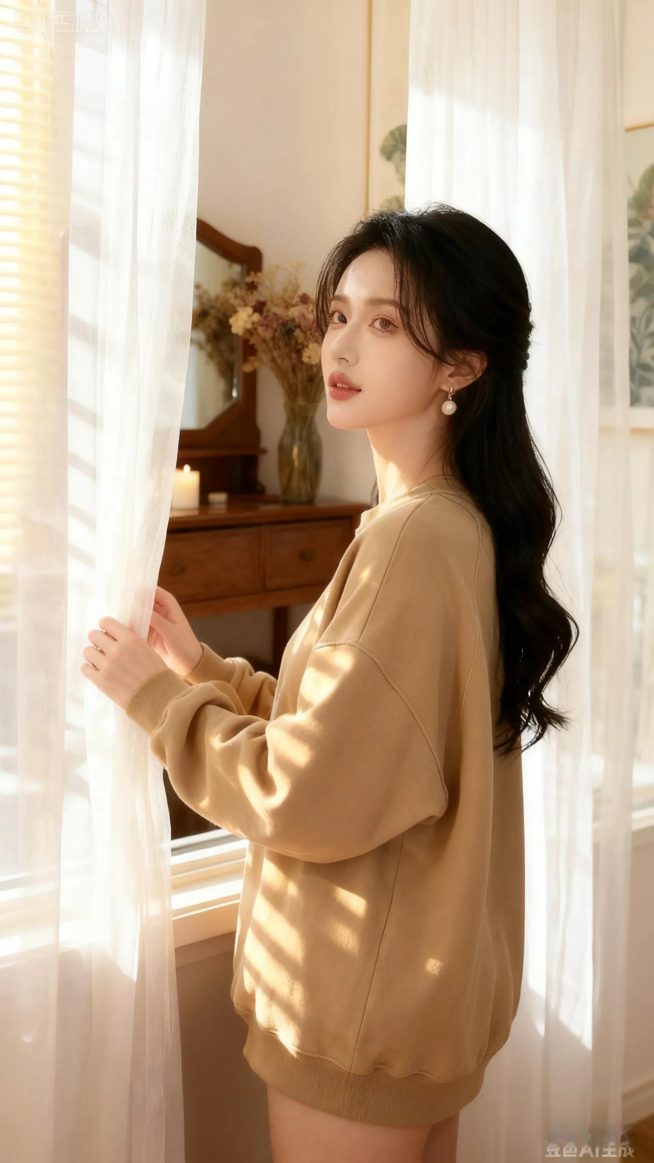 优雅黑发少女,蕾丝裙摆,复古画框,静谧卧室时光。