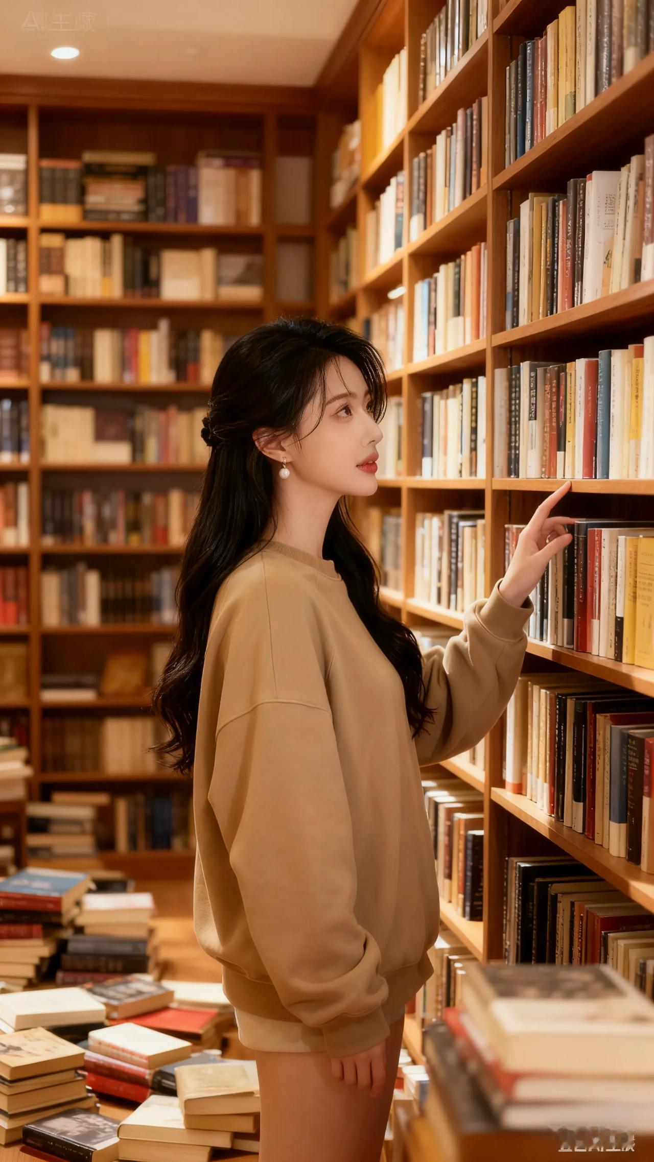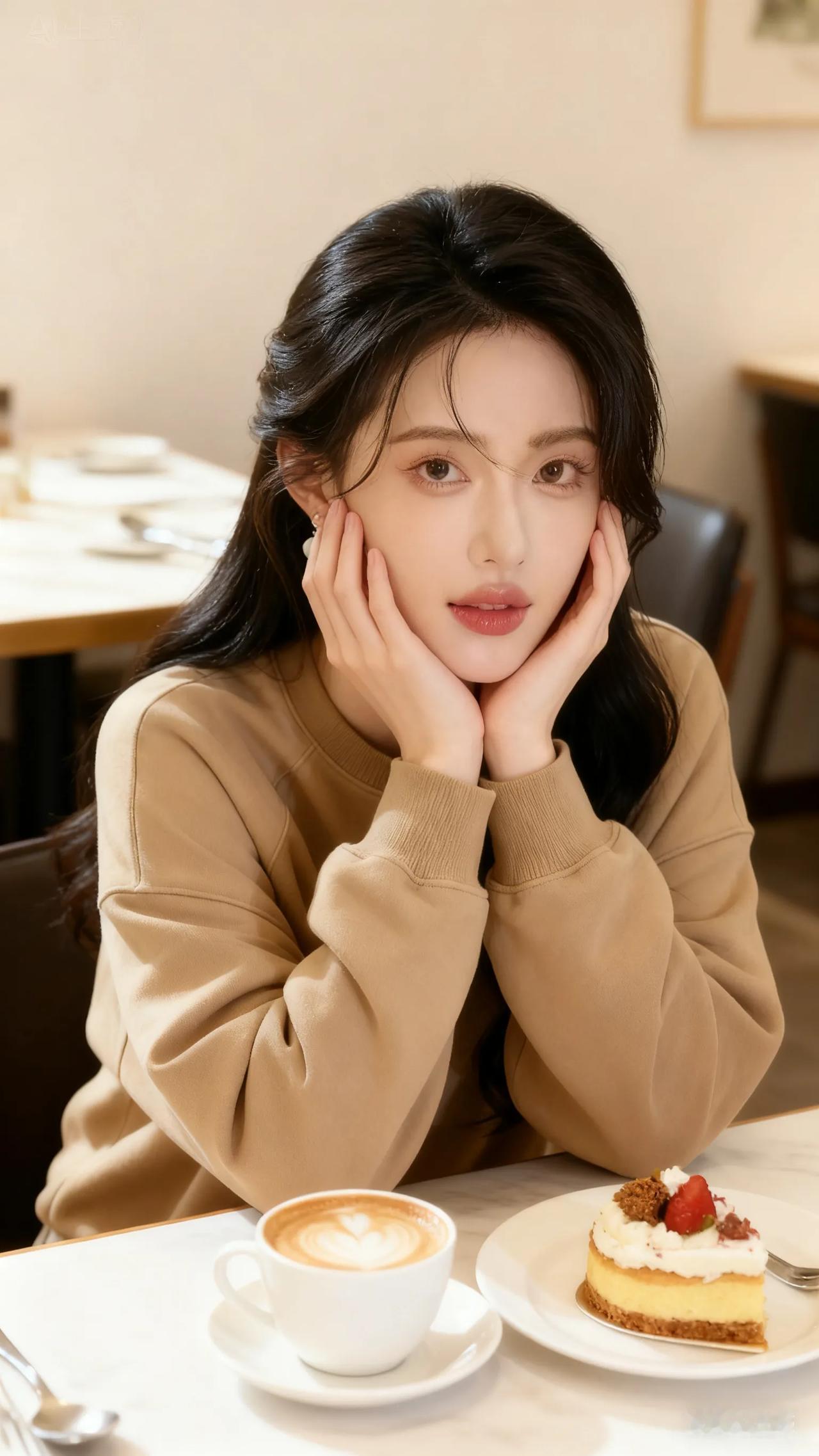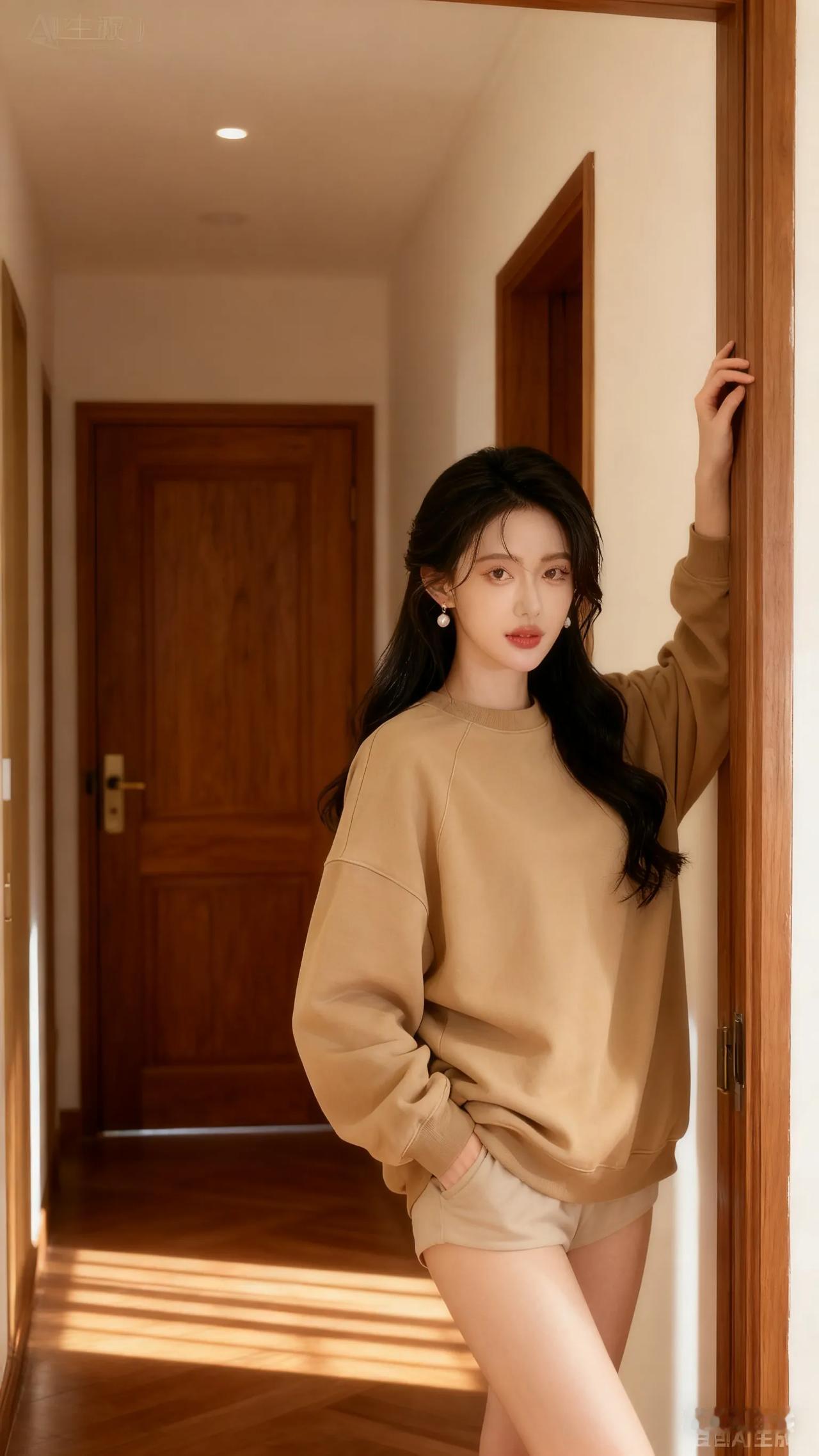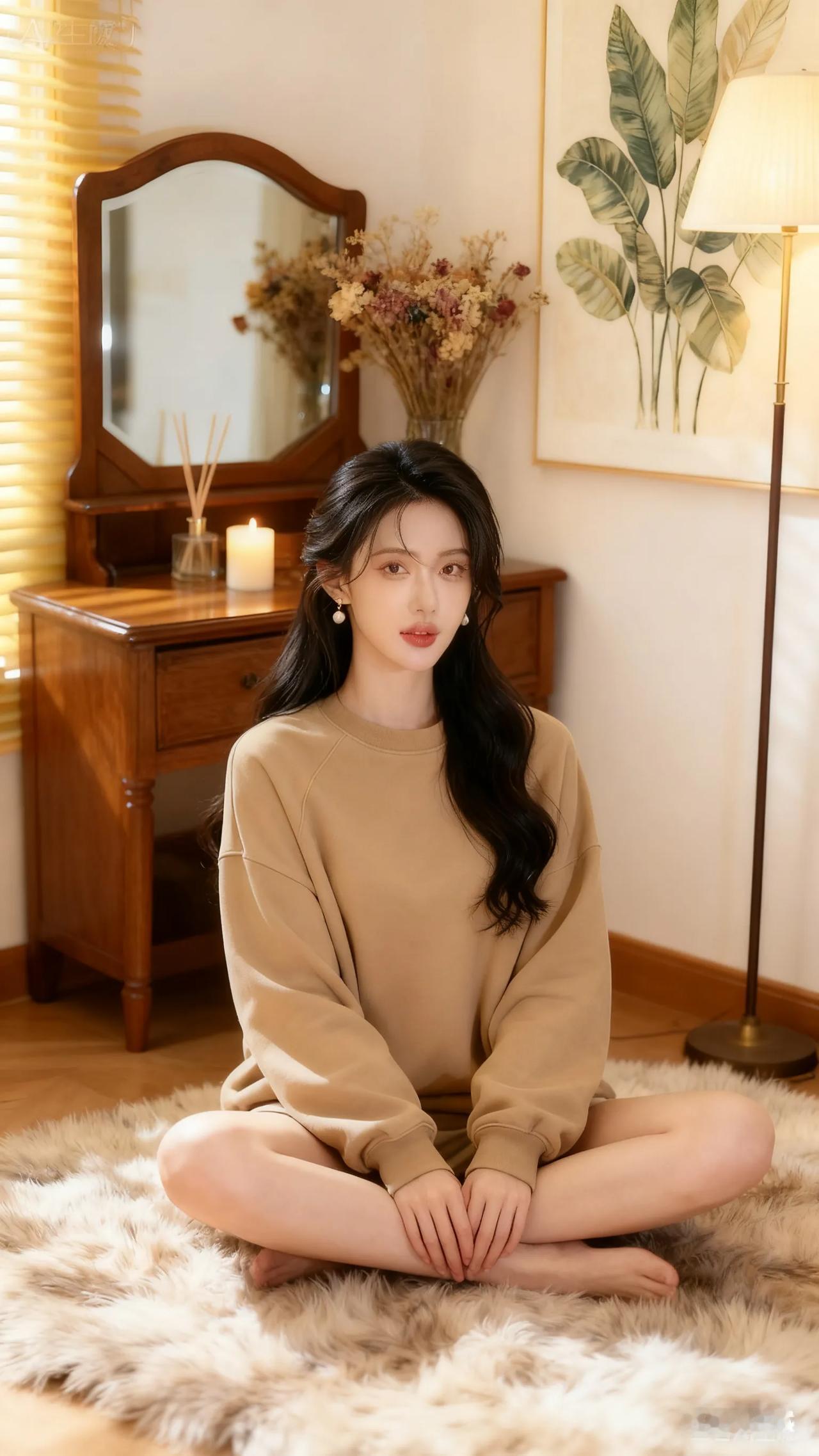 优雅黑发少女,蕾丝裙摆,复古画框,静谧卧室时光。