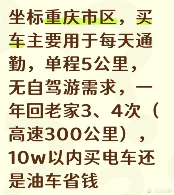 什么样的人我不推荐他买车呢?下面这种就是典型案例,每天路程短且路线固定(来回小于10km),并且日常也没有额外的出行需求,最多也就过年一次长途,这种消费者买车来大概率会成为一年一箱油、过年开一次,买车纯纯是浪费钱,无论选电车还是油车
