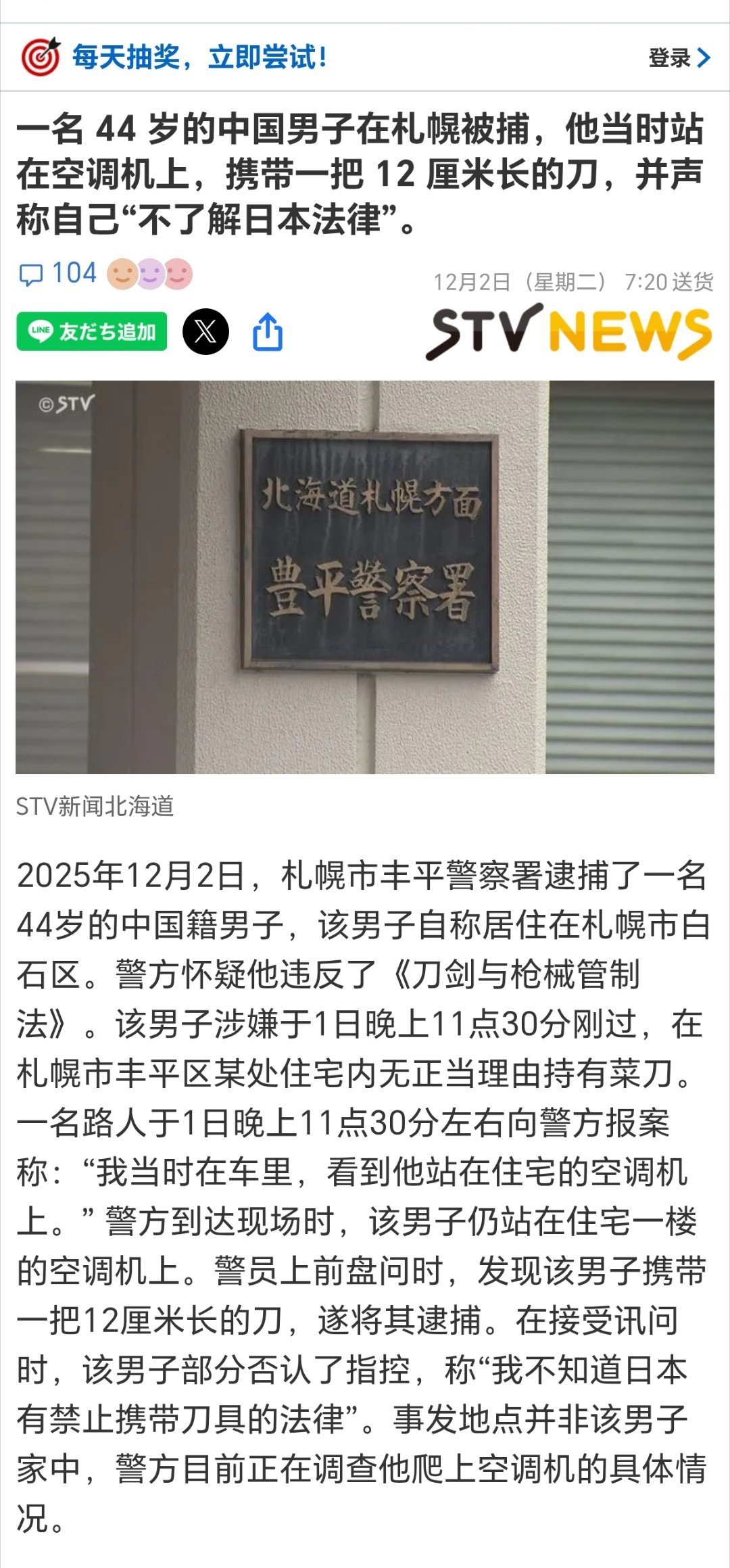 一名44岁的中国男子在日本札幌被捕,原因是他身上带有刀。